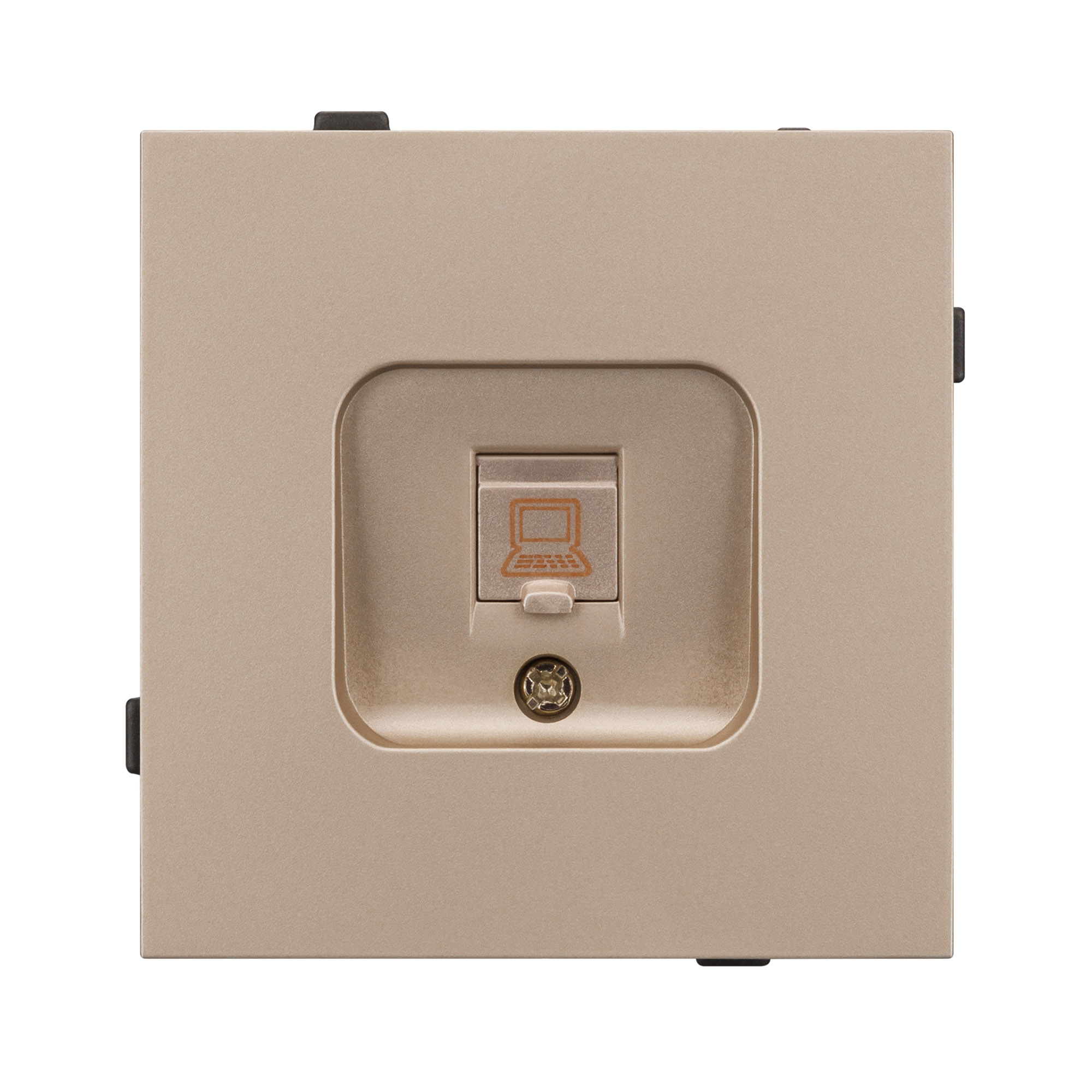 Механизм компьютерной розетки совместим с рамками серии TENDO, создает утонченный минималистичный вид. Скрытый тип монтажа позволяет гармонично встроить в интерьер любого современного дизайн-проекта. Видимая часть механизма выполнена из высококачественного пластика золотого цвета и имеет матовое покрытие.
