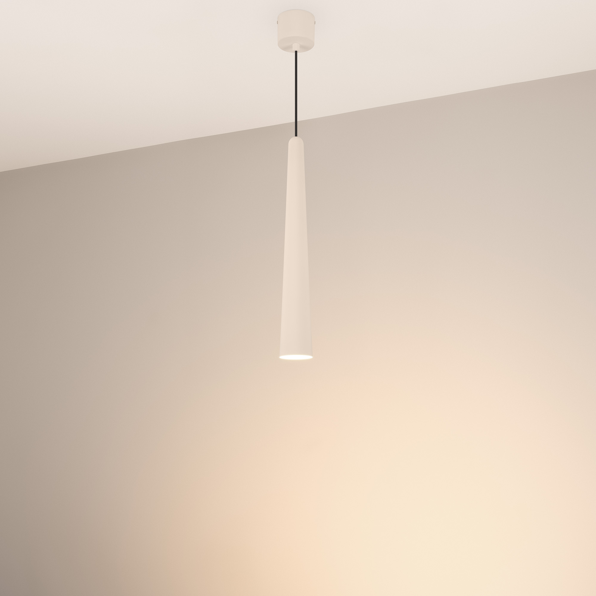 Подвесной светильник. Мощность 5 Вт, св. поток 400 лм, световая эффективность 70 лм/Вт, теплый 3000K, CRI>92, угол 36°, напряжение питания 230 В. Кремовый конусообразный вытянутый корпус из алюминия, линза из PMMA, степень защиты IP20. Размер: диаметр 57 мм, высота 400 мм. Монтаж подвесной, длина подвеса 2000 мм, регулируемая. В комплекте 2 вида чаш. Габариты встраиваемой чаши: Ø 80x41 мм. Габариты накладной чаши Ø80x60 мм. Драйвер 2,8-12В, 500 мА, пульсация <1%.