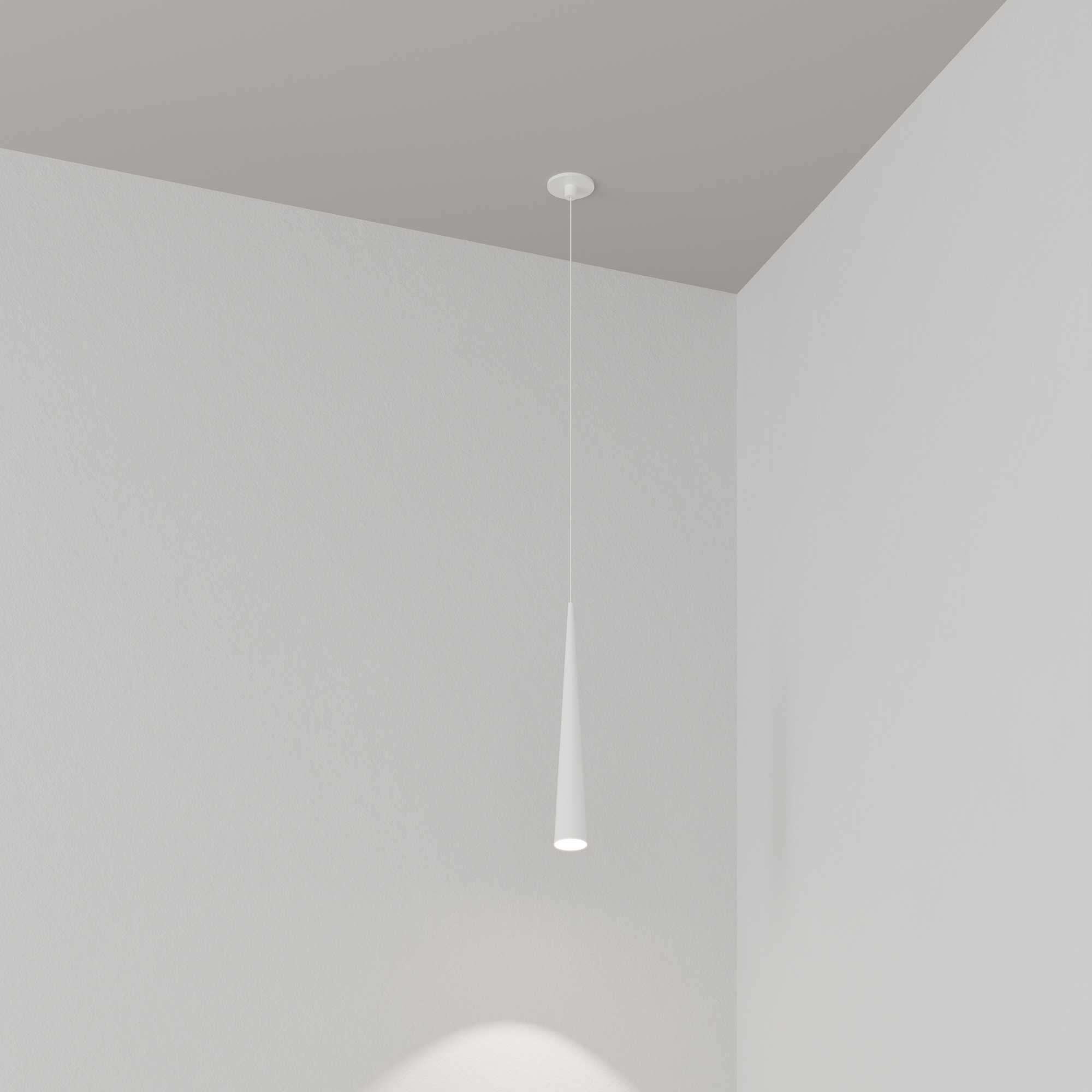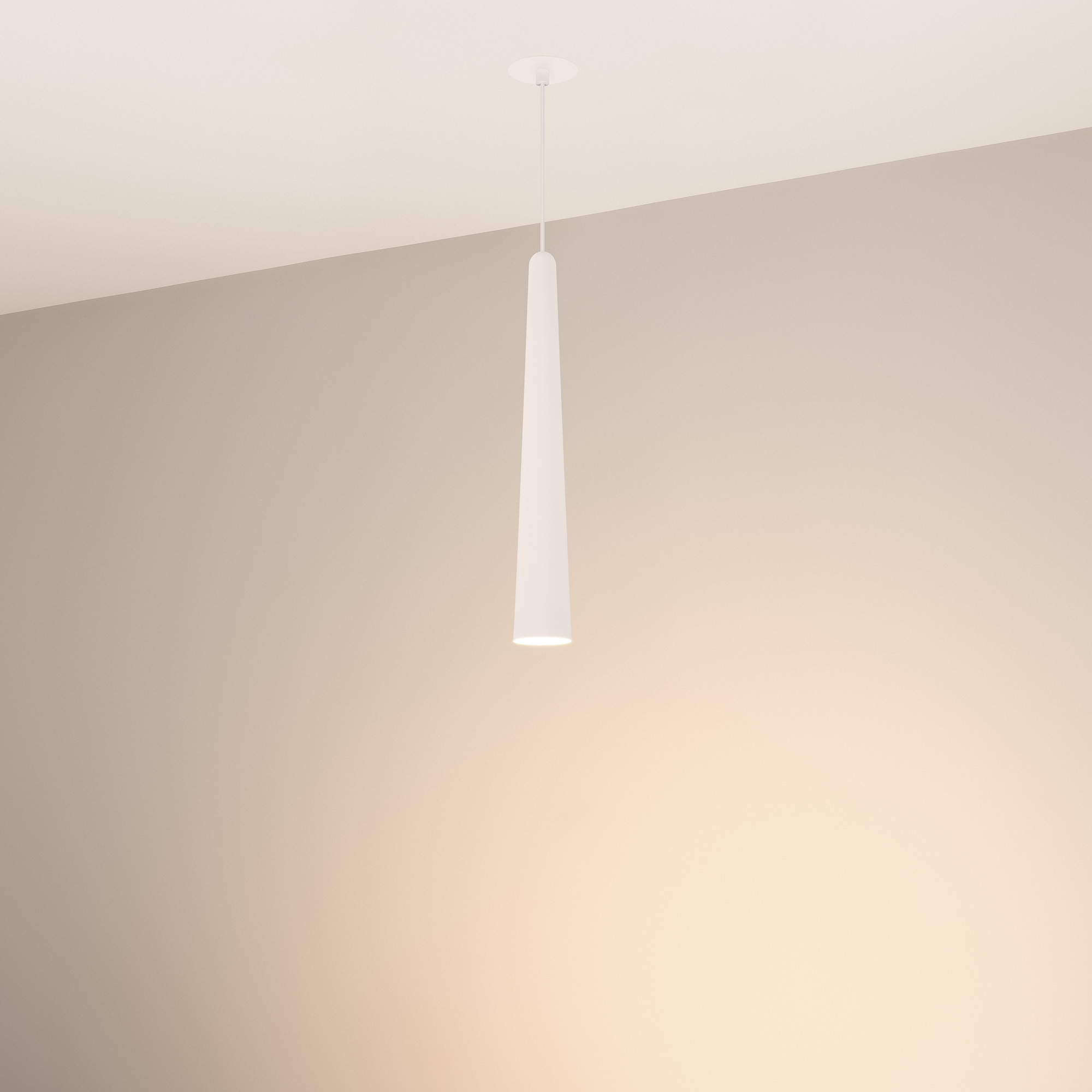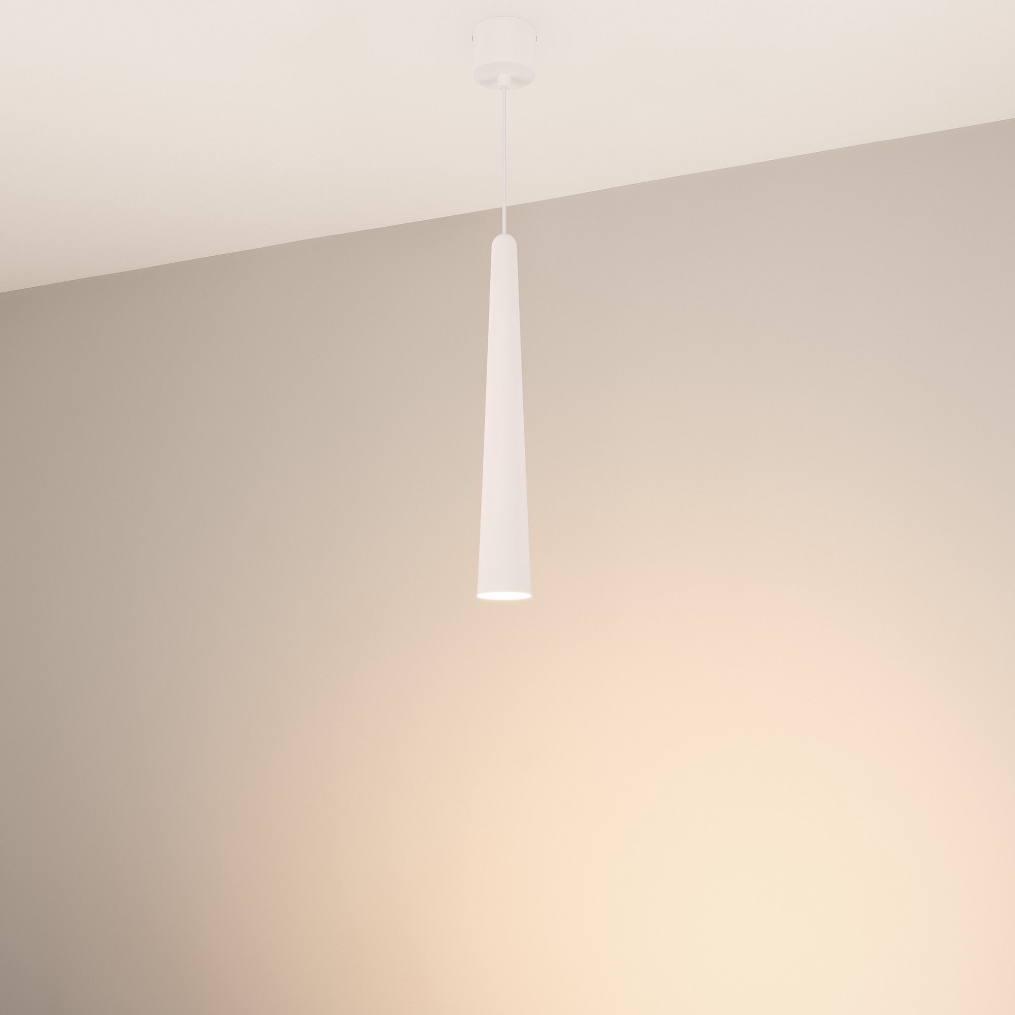 Подвесной светильник. Мощность 5 Вт, св. поток 400 лм, световая эффективность 70 лм/Вт, теплый 3000K, CRI>92, угол 36°, напряжение питания 230 В. Белый конусообразный вытянутый корпус из алюминия, линза из PMMA, степень защиты IP20. Размер: диаметр 57 мм, высота 400 мм. Монтаж подвесной, длина подвеса 2000 мм, регулируемая. В комплекте 2 вида чаш. Габариты встраиваемой чаши: Ø 80x41 мм. Габариты накладной чаши Ø80x60 мм. Драйвер 2,8-12В, 500 мА, пульсация <1%.