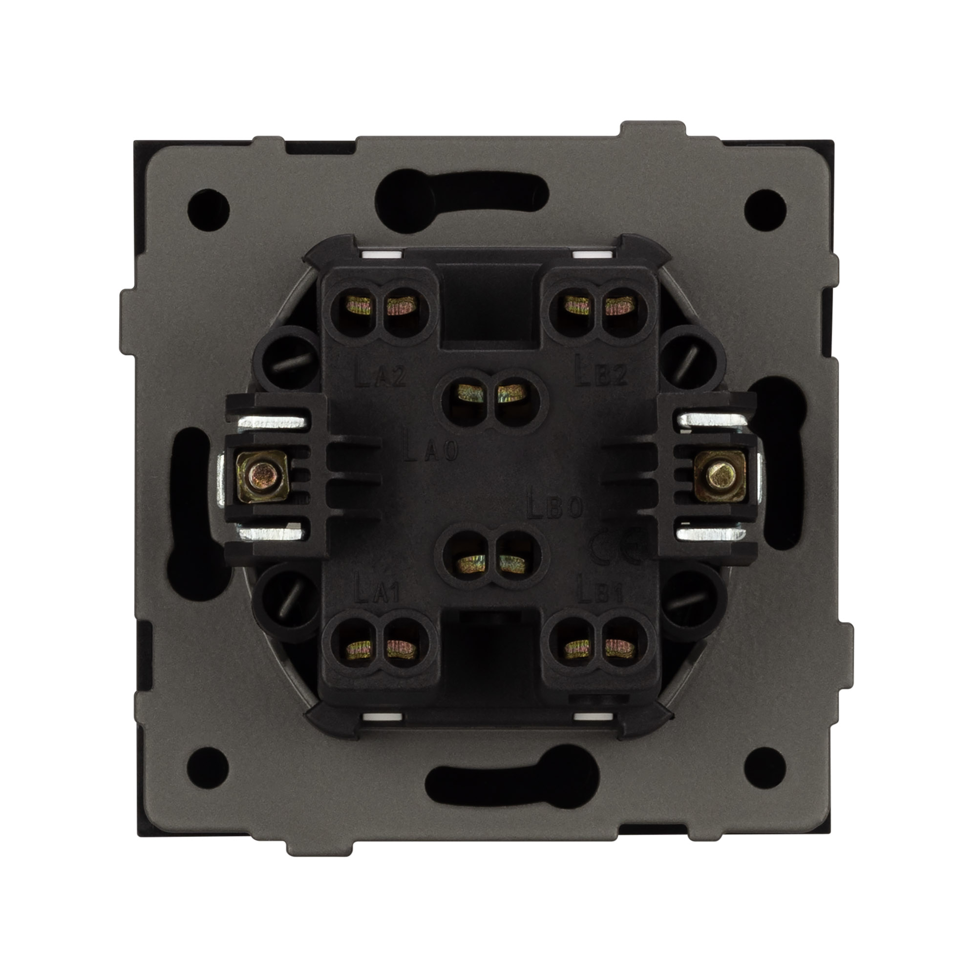 Механизм выключателя света совместим с рамками серии TENDO, создает утонченный минималистичный вид. Скрытый тип монтажа позволяет гармонично встроить в интерьер любого современного дизайн-проекта. Видимая часть механизма выполнена из высококачественного пластика матового графитового цвета и имеет Soft-Touch покрытие, что придает изделию приятные тактильные ощущения и стильный внешний вид. Контактная часть присоединяется при помощи винтовых зажимов, позволяя надежно подсоединить механизм выключателя к питающим элементам. А усиленные распорные лапки двойного захвата надежно фиксируют механизм в установочном подрозетнике круглого сечения диаметром 60мм. Суппорт окрашен порошковой краской и выполнен из металла толщиной 1,5мм, что обеспечивает безопасность и уверенность в установке. На каждой стороне суппорта размещены фиксирующие элементы, позволяющие комбинировать механизмы в системы до 5 шт как горизонтально, так и вертикально.