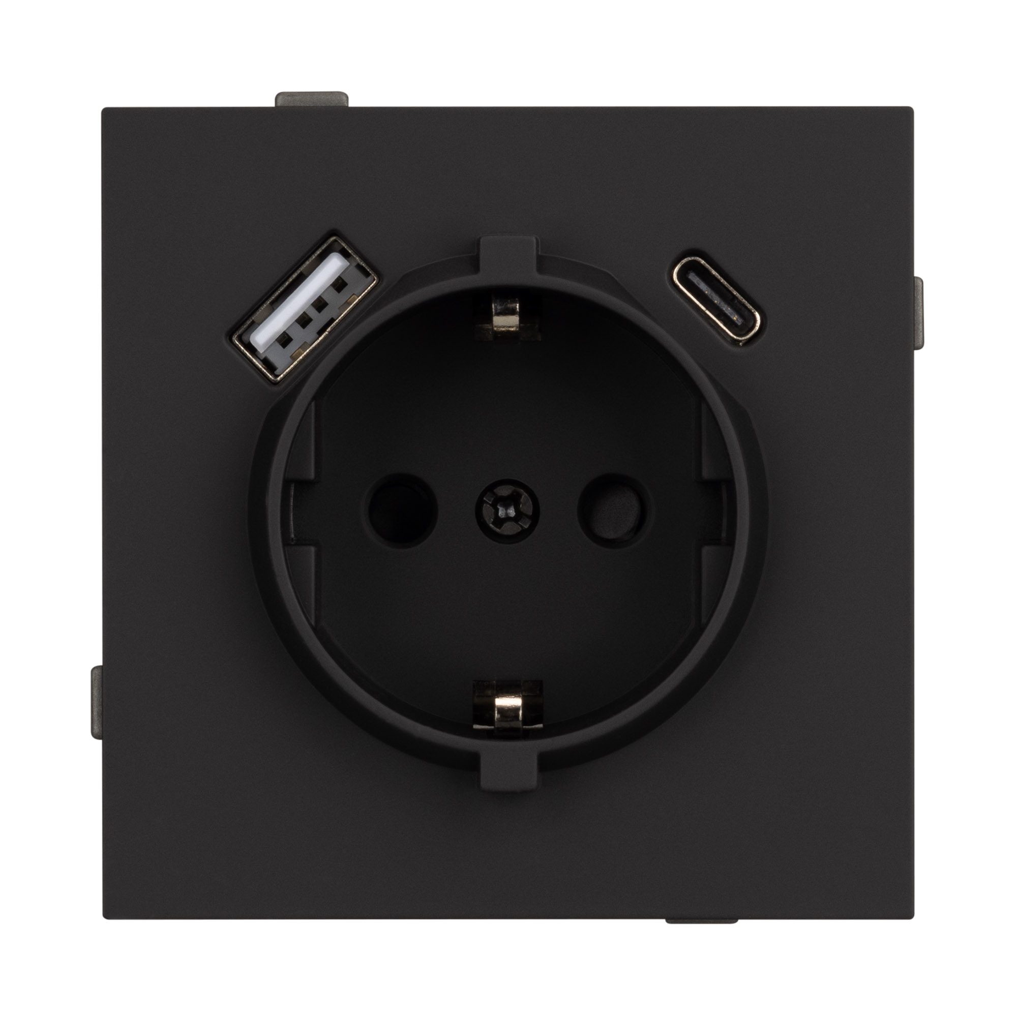 Механизм розетки с заземлением 1 пост 2 USB Type A+C порта. Цвет - матовый черный, с Soft-Touch покрытием. Без фронтальной рамки. Уровень пылевлагозащиты IP20. Розетка устанавливается в стандартный подрозетник круглого сечения диаметром 60мм. Габаритные размеры: длина 71 мм, ширина 71 мм, высота 53 мм. Гарантийный срок 10 лет.