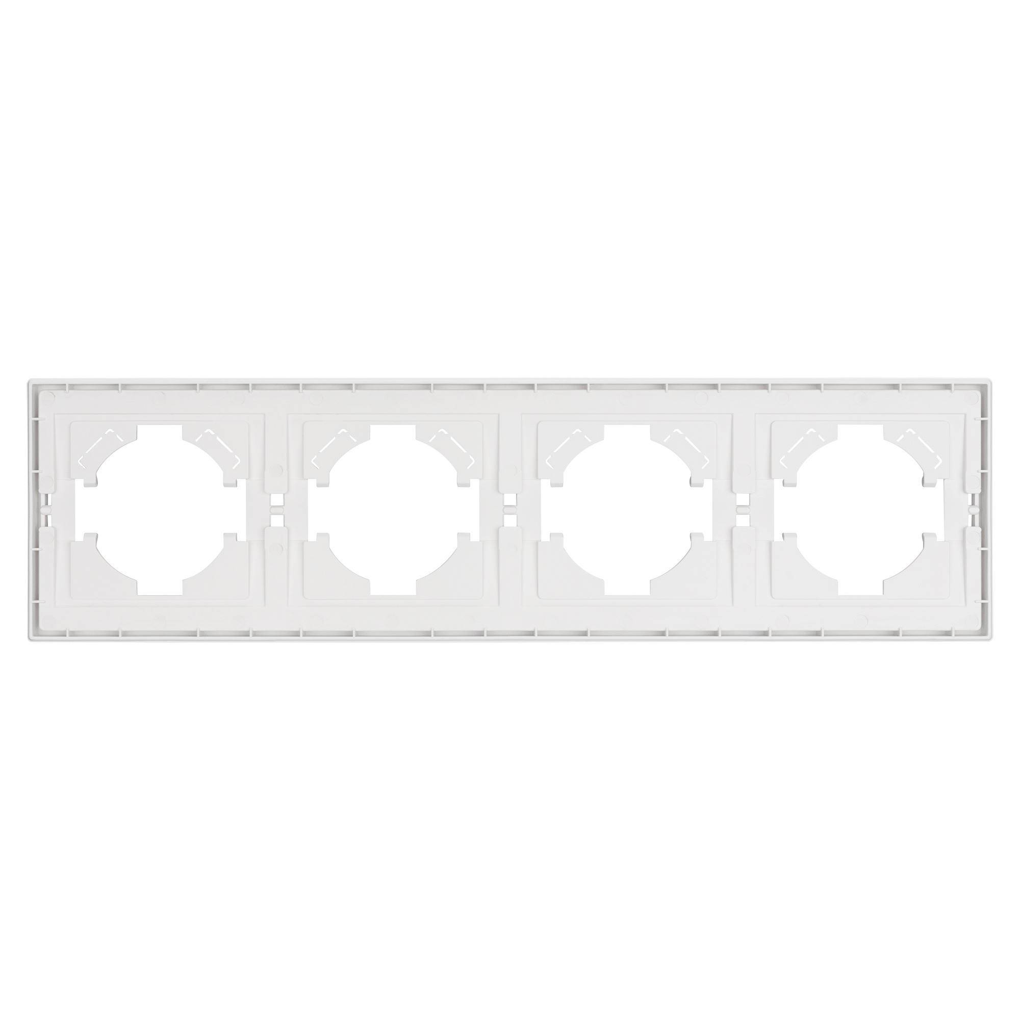 Рамка пластиковая на 4 поста, под встраиваемый механизм. Цвет - матовый белый, с Soft-Touch покрытием. Среднего уровня герметичности IP20. Ориентация монтажа горизонтальная. Габаритные размеры: длина 294 мм, ширина 80 мм, высота 9 мм. Гарантийный срок 12 мес.