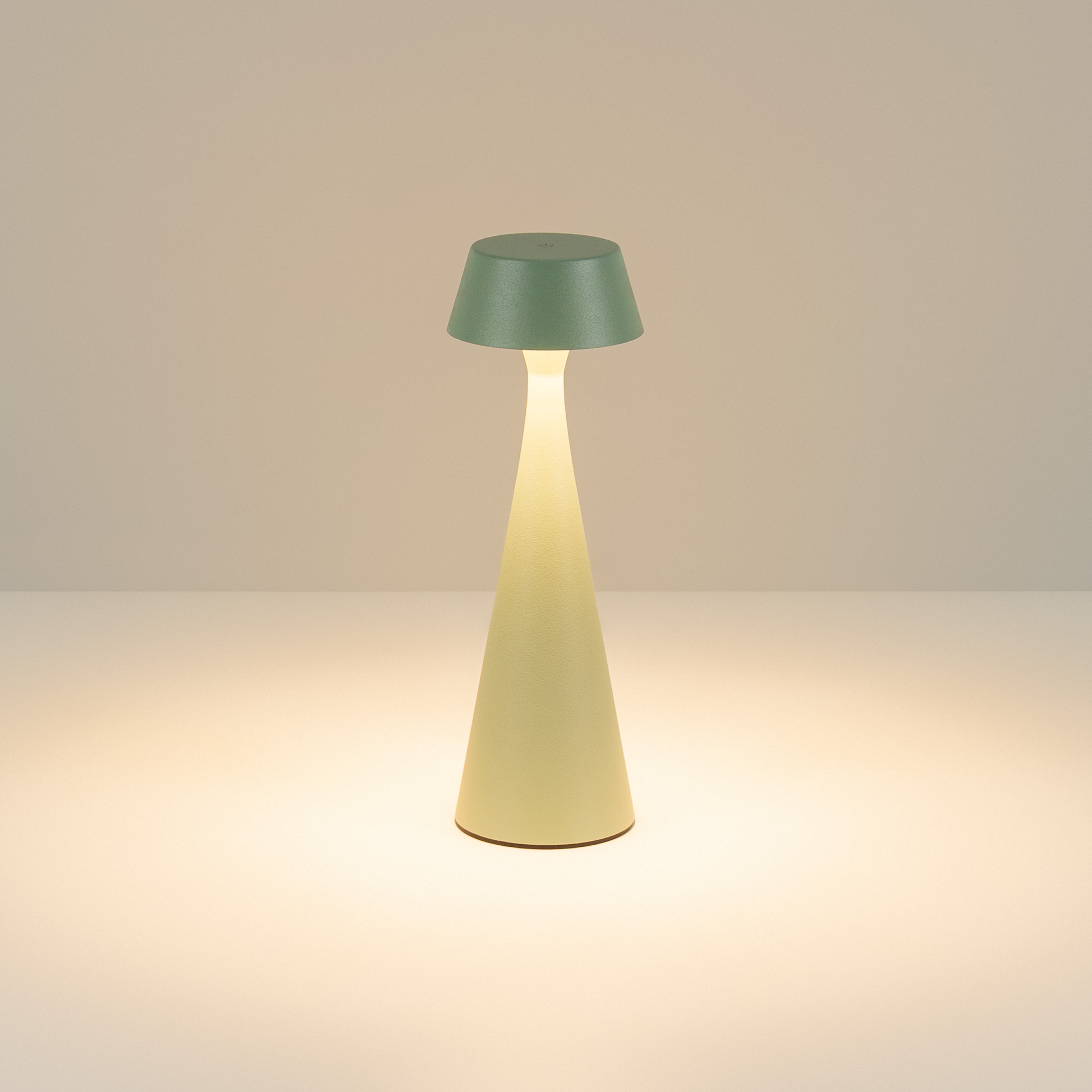 Настольный светильник со встроенным аккумулятором, 2Вт, алюминиевый корпус, цвет зеленый. Цвет ТЕПЛЫЙ БЕЛЫЙ 2200-2700-3000K, св.поток 110-130 лм, CRI(Ra)>80, угол 154°. Размер Ф80x242мм. IP54. Зарядка от сети переменного тока AC220-240V. Тип встроенного аккумулятора 2x2200мАч Li-ion, напряжение батареи 5V