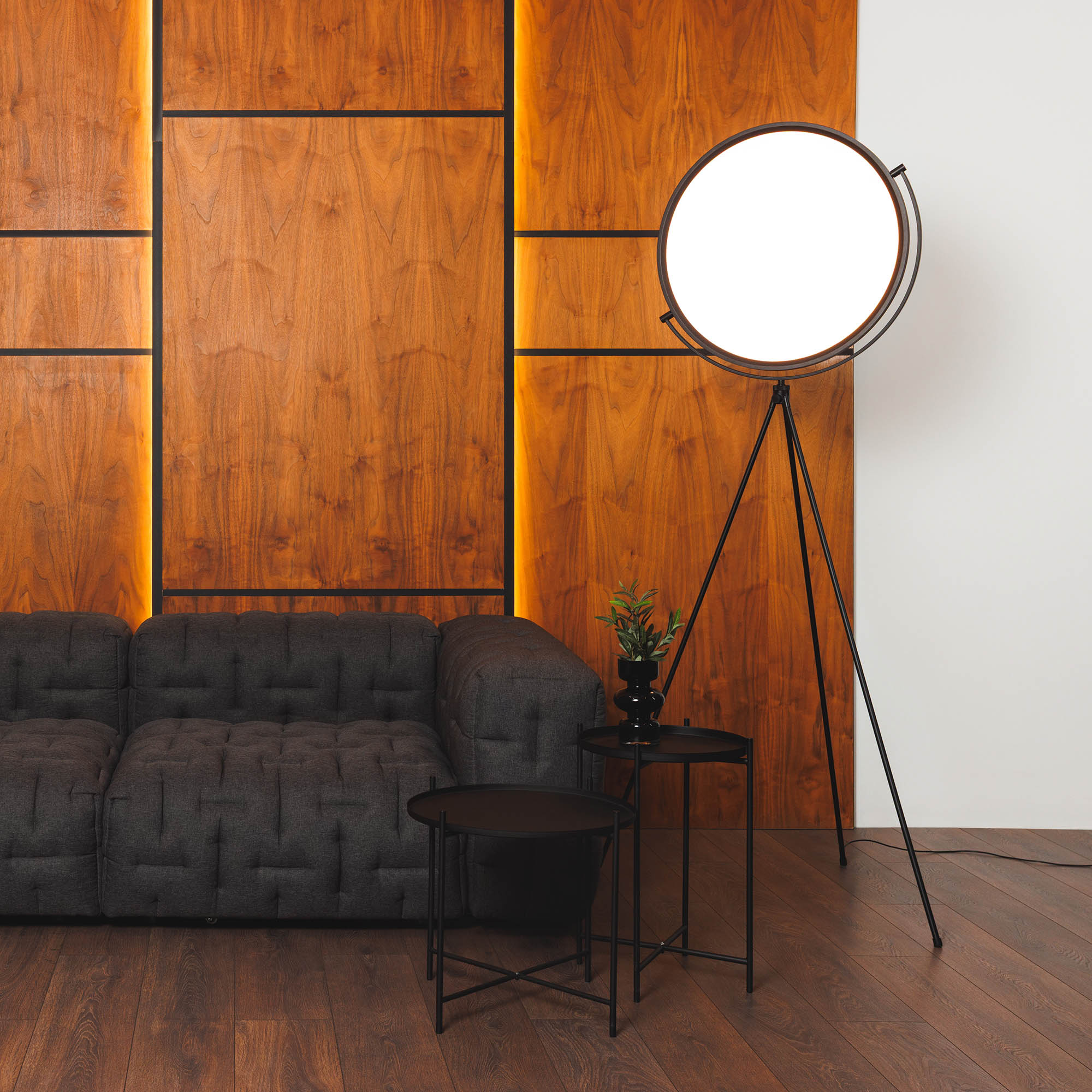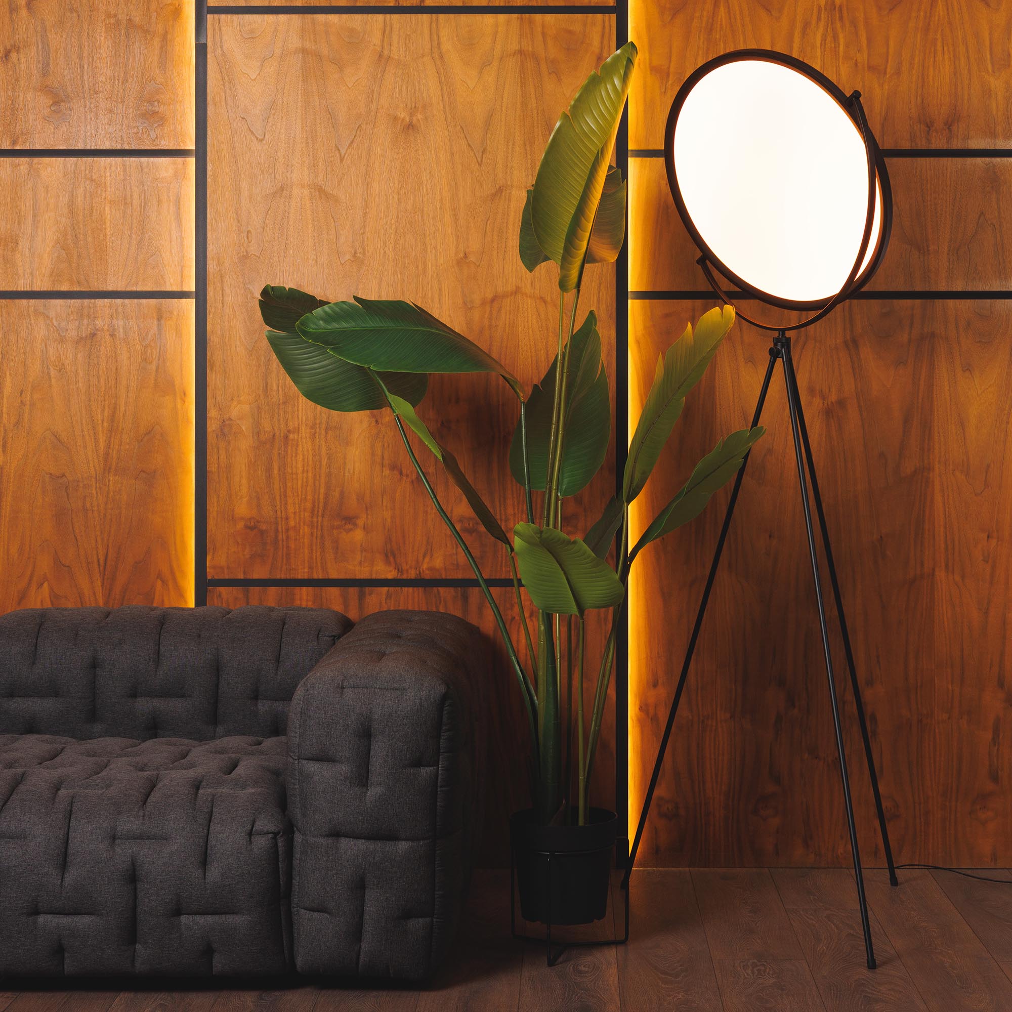 Декоративный напольный светильник с функцией Dim-to-Warm. Мощность 35 Вт, Dim-to-warm 1800K-3000K, CRI>90, угол 120 °, напряжение питания 230 В. Корпус из алюминия черного цвета, экран из PMMA, степень защиты IP20. Размер: диаметр диска 660 мм, диаметр излучающего модуля 595мм, высота с ножкой 1890 м. Угол поворота диска 355°. Длина провода 1300 мм, питание от сети 220-240V. Адаптер в комплекте. Управление с помощью сенсорного диммера-кнопки.