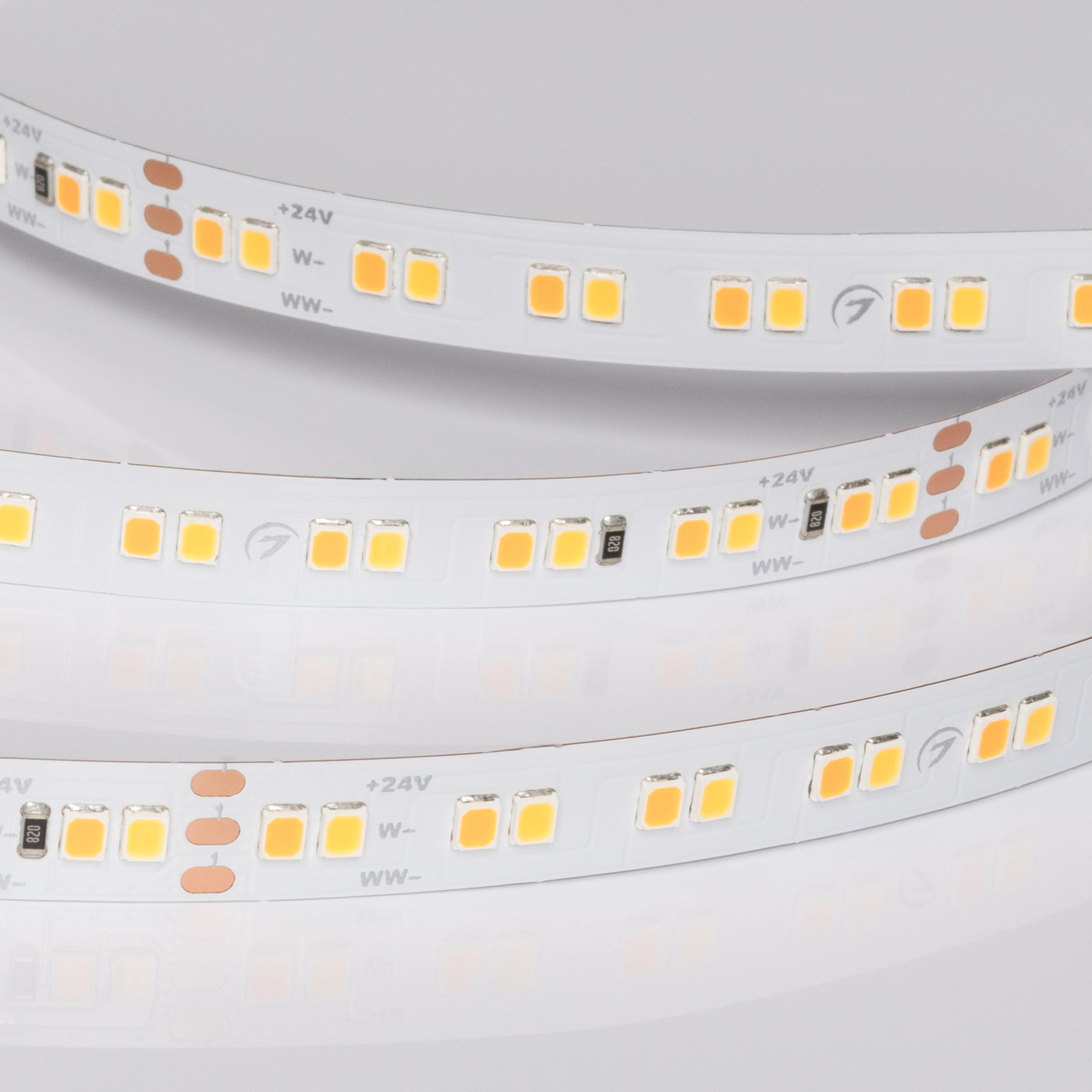 Светодиодная лента серии UL A160, шириной 10 мм, мощностью 12 Вт/м, с изменяемым цветом свечения (MIX) в диапазоне от дневного (4000K) до теплого (2400K). Напряжение питания 24 В. Светодиоды SMD 2835, 160 шт/м. Высокий индекс цветопередачи CRI>90, обеспечивающий точное восприятие цветов при освещении любых жилых и коммерческих помещений. Минимальный отрезок 100 мм (16 светодиодов). Двухканальная лента с тремя проводами для подключения, управляется MIX-контроллером. Подключение 5 м с одной стороны. Применяется для создания биодинамического освещения, уютной атмосферы, декоративной подсветки элементов интерьера, мебели. Рекомендуется установка на профиль.