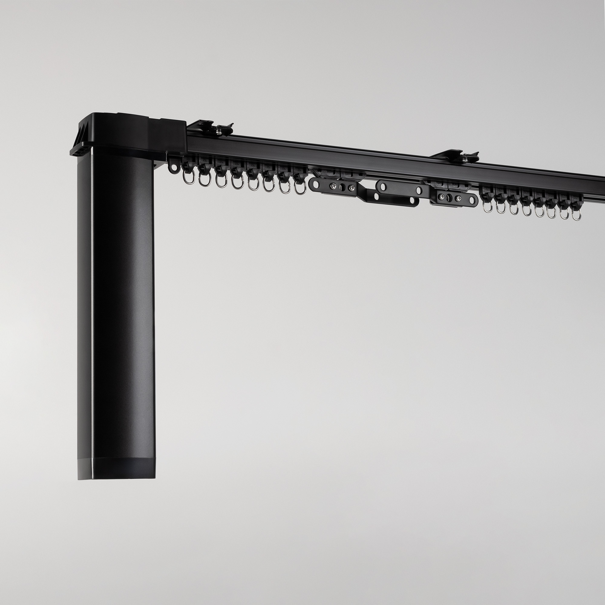 Комплект электрокарниза в черном цвете длиной до 2м (регулируется наборными частями) для раздвижных штор, состоящий из мотора, наборного алюминиевого трека, пульта и комплектующих. Электропривод с питанием 100-240В, мощность 45Вт, момент 1.2Нм, вес штор до 40кг. Управление с помощью пульта из комплекта, по WI-FI, 2.4ГГц, Bluetooth, "сухими" контактами на входе 4P4C. Совместим с платформой TUYA, АЛИСА от ЯНДЕКС. Управление со смартфона через приложение SmartLife, с помощью пульта в комплекте.