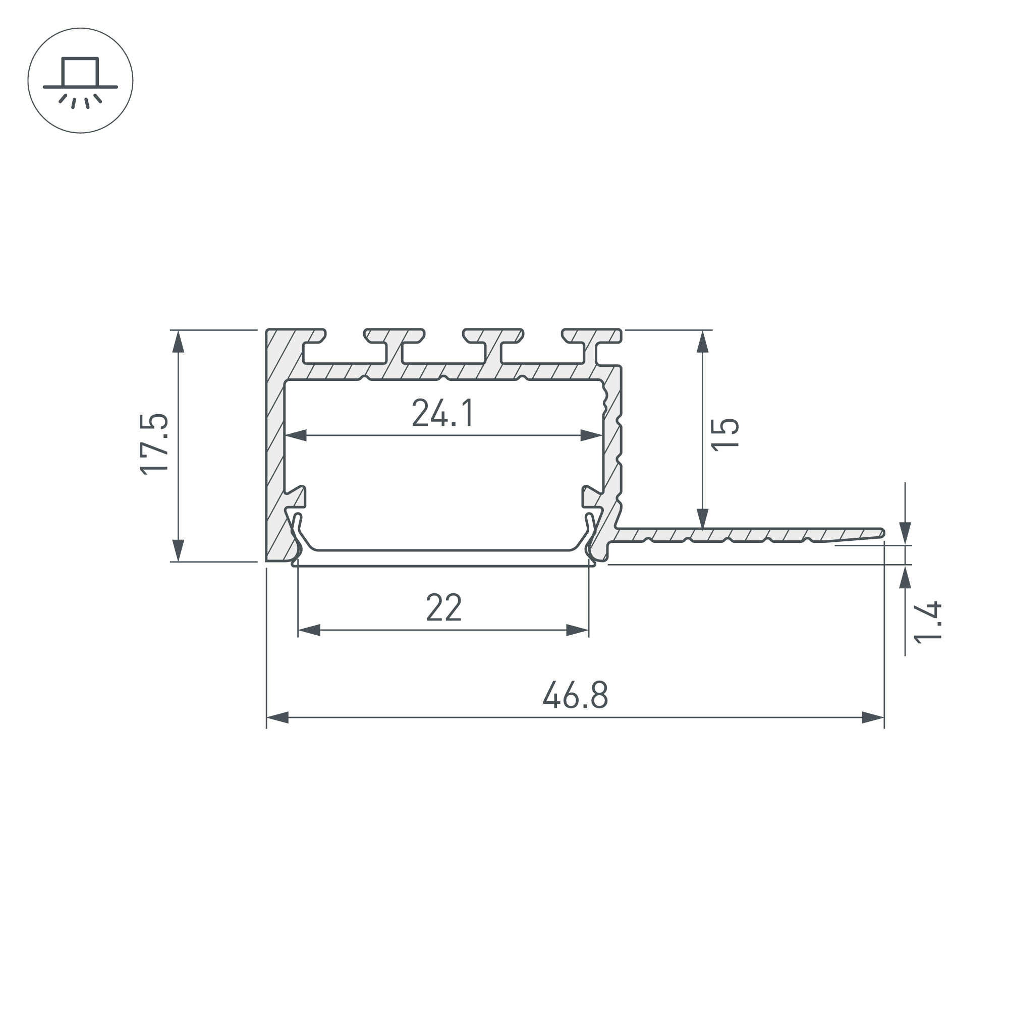 Габаритные размеры профиля составляют 2000 мм в длину, 46,8 мм в ширину и 17,5 мм в высоту. Площадка для установки светодиодных лент позволяет использовать ленту шириной до 24 мм и мощностью до 37 Вт/м. Это обеспечивает гибкость в выборе светодиодных лент и создает потрясающие световые решения.