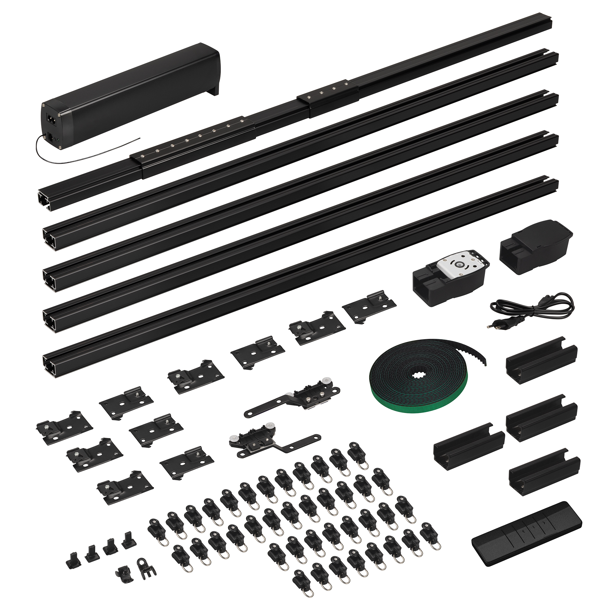 Комплект электрокарниза в черном цвете длиной до 5м (регулируется наборными частями) для раздвижных штор, состоящий из мотора, наборного алюминиевого трека, пульта и комплектующих. Электропривод с питанием 100-240В, мощность 45Вт, момент 1.2Нм, вес штор до 40кг. Управление с помощью пульта из комплекта, по WI-FI, 2.4ГГц, Bluetooth, "сухими" контактами на входе 4P4C. Совместим с платформой TUYA, АЛИСА от ЯНДЕКС. Управление со смартфона через приложение SmartLife, с помощью пульта в комплекте. Ремень из комплекта находится на дне коробки. 1 мотор, 1 пульт дистанционного управления, алюминиевый профиль 1,6 мм (1м - 4шт, 0.5м - 1шт, 0.2м - 2шт., 0.1м - 1 шт.), 4 соединителя 10 см, 1 соединитель 20 см, 1 переходник 5 см, 2 шкива, 2 пряжки ремня, 2 направляющих бегунка, ремень 10,4 м, 24 бегунка, 2 фиксатора, 10 кронштейнов, 1 зажим на ремень