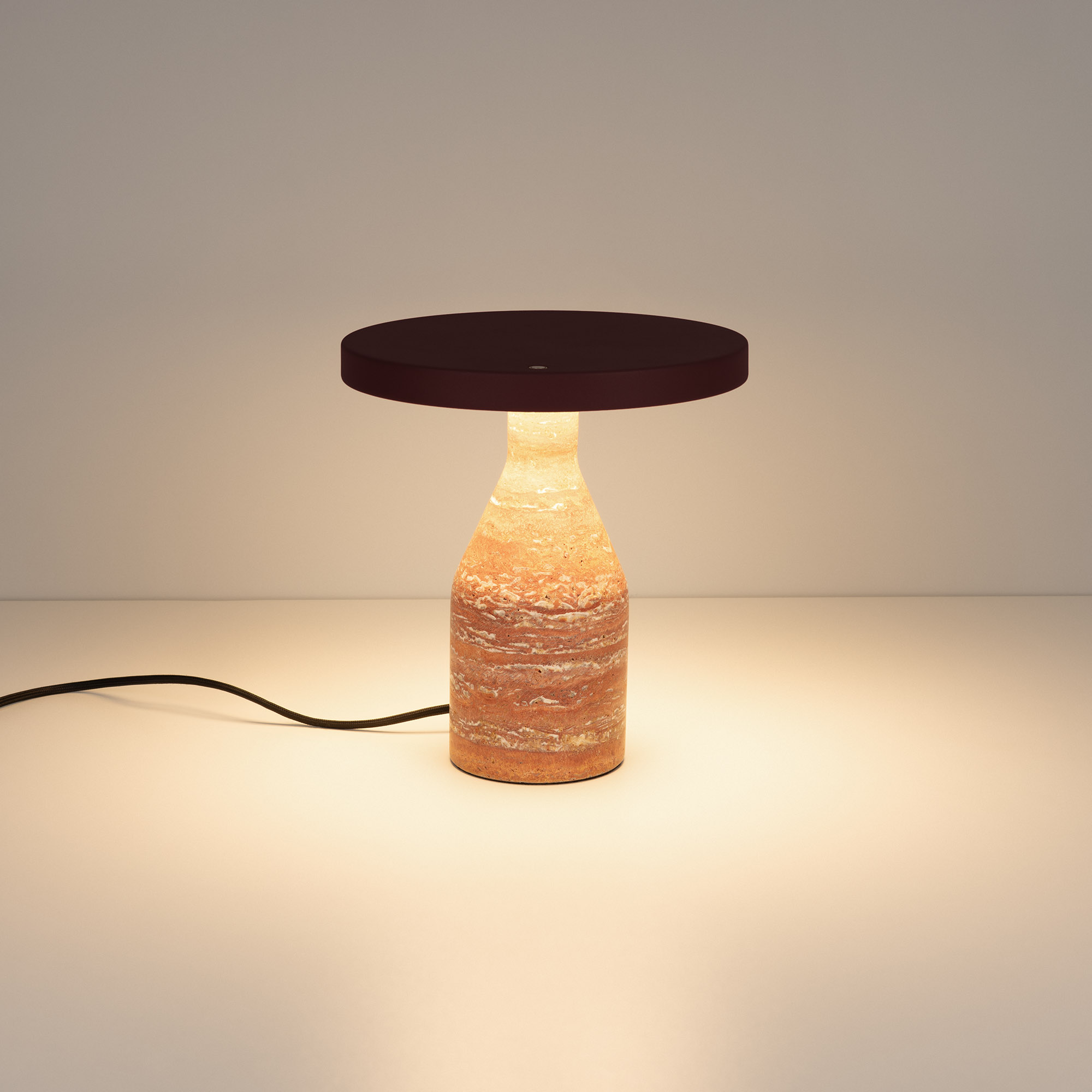 Настольный светильник CROOD. С изменяемой цветовой температурой 2700/3200/4000K, переключается коротким нажатием на сенсорную кнопку на плафоне, диммирование происходит за счет ее удержания. Мощность 7 Вт, св. поток 159 лм, 23 лм/Вт, теплый 3000 K, CRI>94, угол 140°, напряжение питания 230 В. Красный плафон из алюминия, основание из травертина, степень защиты IP20. Общая высота 240 мм. Габариты светового модуля DхH: 225 x 22 мм. Габариты основания DхH:: 100 x 220 мм. Пульсация <1%.