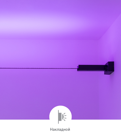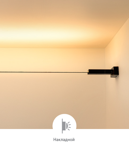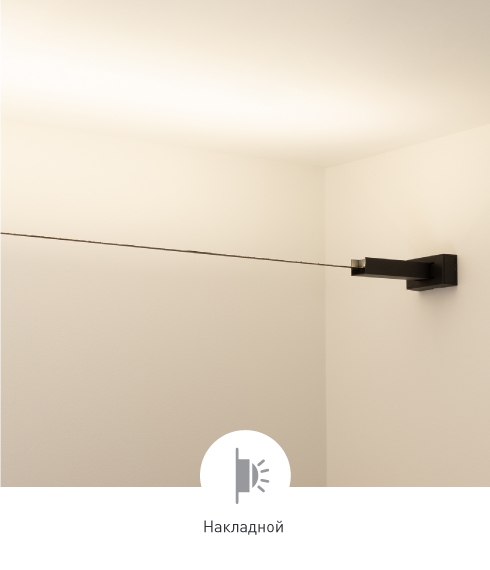 Система креплений позволяет располагать трос с установленной на нем светодиодной лентой в свободном пространстве между стенами или между полом и потолком.