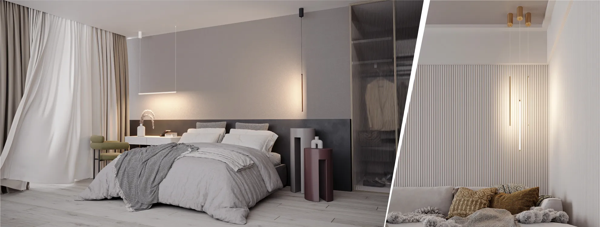 Композиции из нескольких светильников будут стильно смотреться при оформлении гостиных и спальных зон.