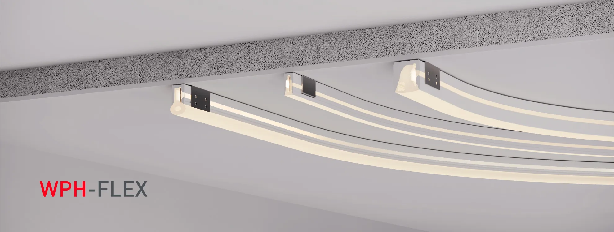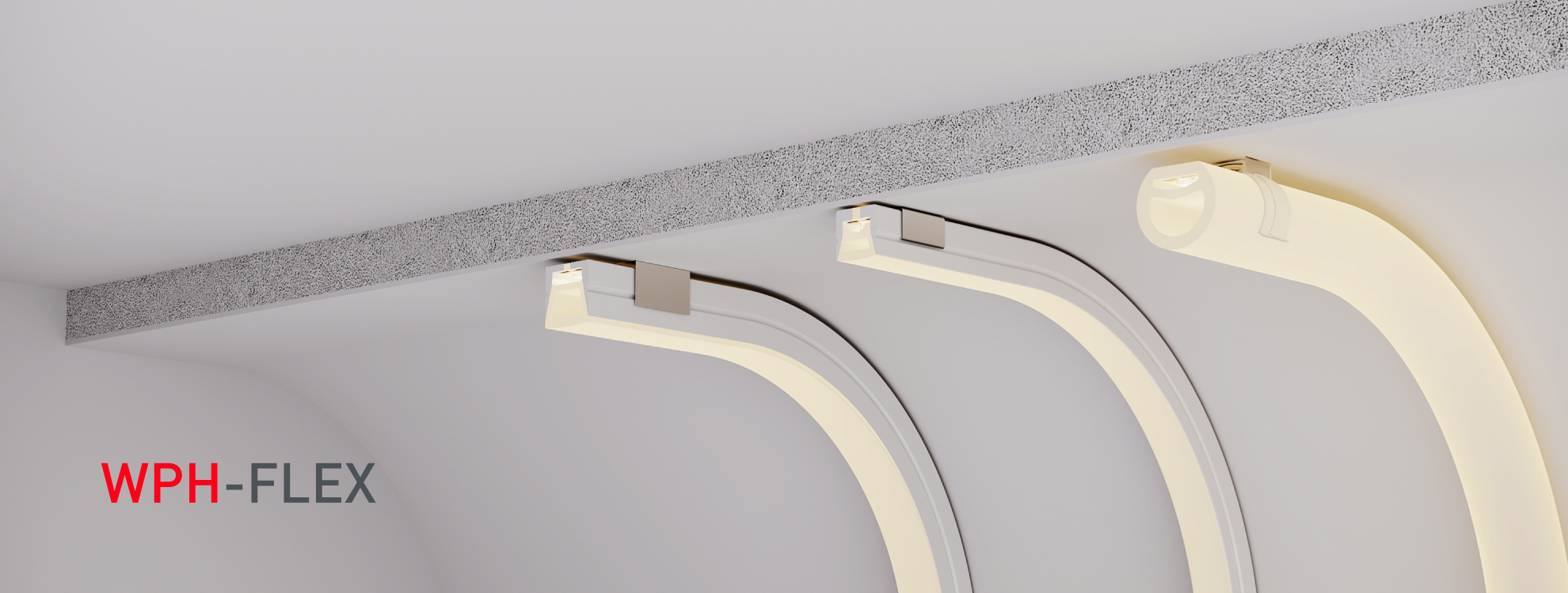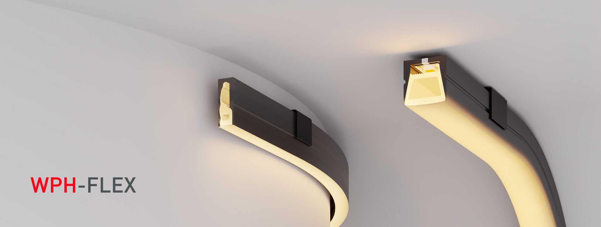 Сечение разных форм В серии WPH FLEX вы найдете профили с прямоугольной и круглой формой сечения. Ассортимент прямоугольных профилей представлен моделями с разными размерами сечения, возможностью вертикального изгиба (TOP), горизонтального (SIDE), а также 2-в-1 с возможностью изготовлении скрученных форм TWIST. Гибкие круглые профили со свечением 360° имеют диаметр 22 и 40 мм. Модели с диаметром 22 мм представлены не только в белом и черном цвете, но и в оплетке из нейлоновой нити.