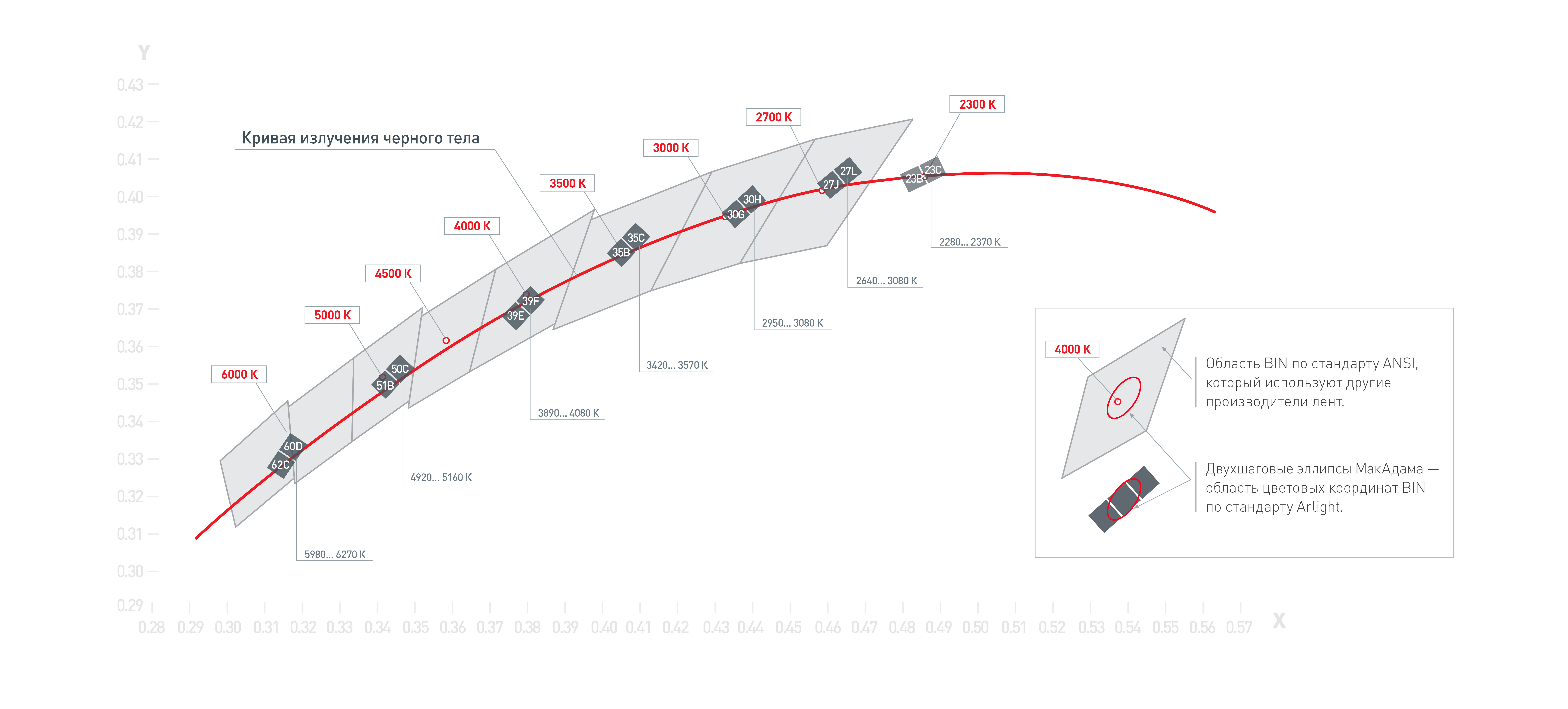 При производстве светодиодов осуществляется контроль качества с одновременной сортировкой в группы BIN по цветовой температуре, величине светового потока и другим параметрам. Сортируется в пределах двухшаговых эллипсов МакАдама (соответствует стандартному цветовому отклонению), что позволяет минимизировать разброс параметров.