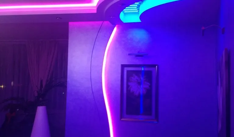 Многоцветная RGB подсветка была установлена во многочисленных нишах во всех частях квартиры: прихожей, гостиной, спальных комнатах и даже ванной.