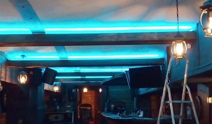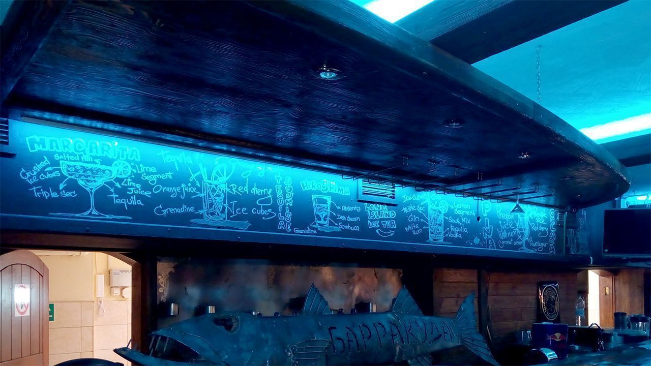 Подчеркнуть выбранную стилистику призвана светодиодная подсветка, которая создала эффект нахождения под водой. Для этого светодиодная лента RGB arlight® была установлена в декоративные, имитирующие дерево, балки под потолком. Лента была также установлена для освещения стенки вентиляционного короба, который одновременно служит для написания барного меню.