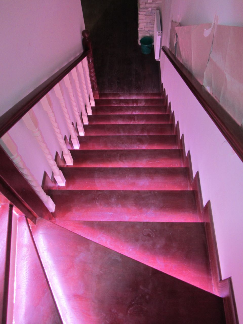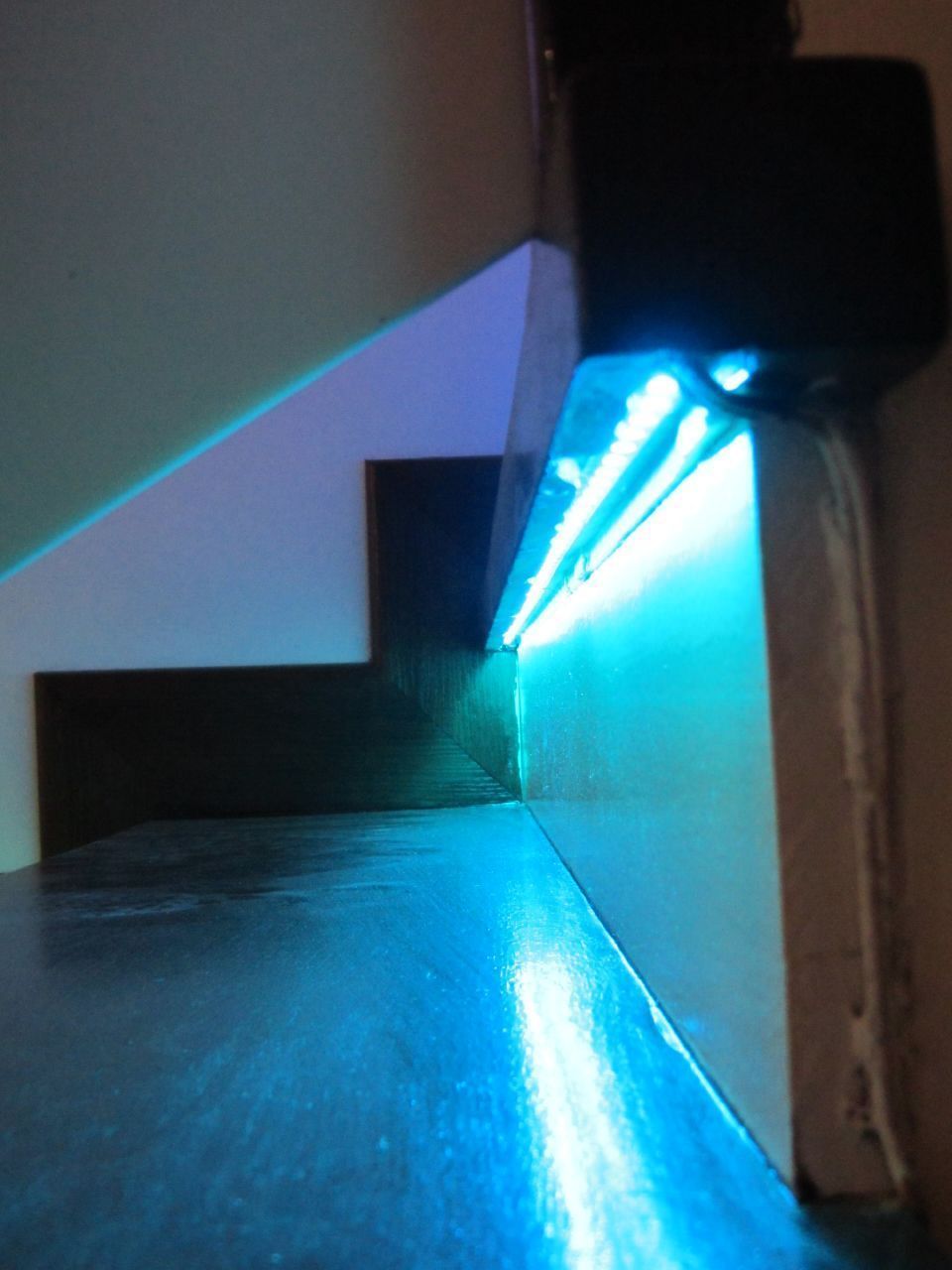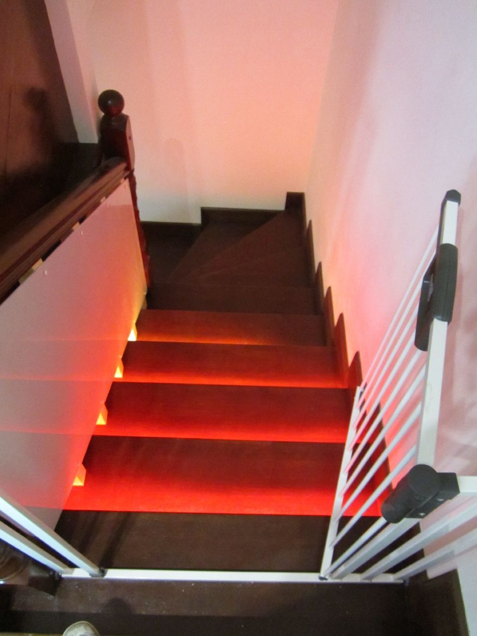 Включение подсветки запускается при подходе к лестнице от инфракрасных датчиков движения внизу и вверху неё. Изюминкой данной лестницы стал световой эффект постепенного освещения ступеней. Ступени загораются снизу вверх при подъеме по лестнице и сверху вниз при спуске с неё. При этом ступени загораются не просто одна за другой, а постепенно, слева направо (относительно направления движения). Светодиодная подсветка работает в двух режимах - белом и многоцветном (цвета радуги).