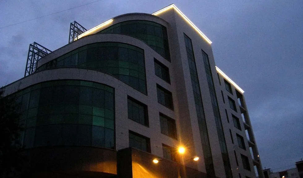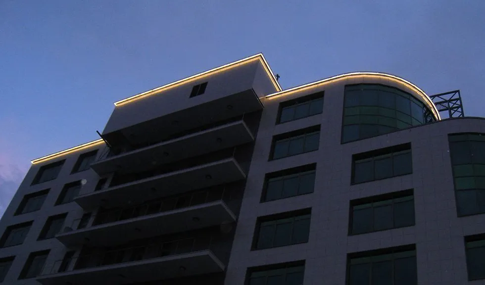 Подсветка была установлена по периметру крыши здания и обозначает её контуры. Свечение подсветки направлено вниз, на фасад строения.