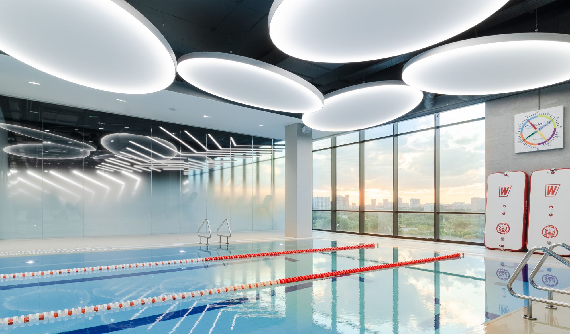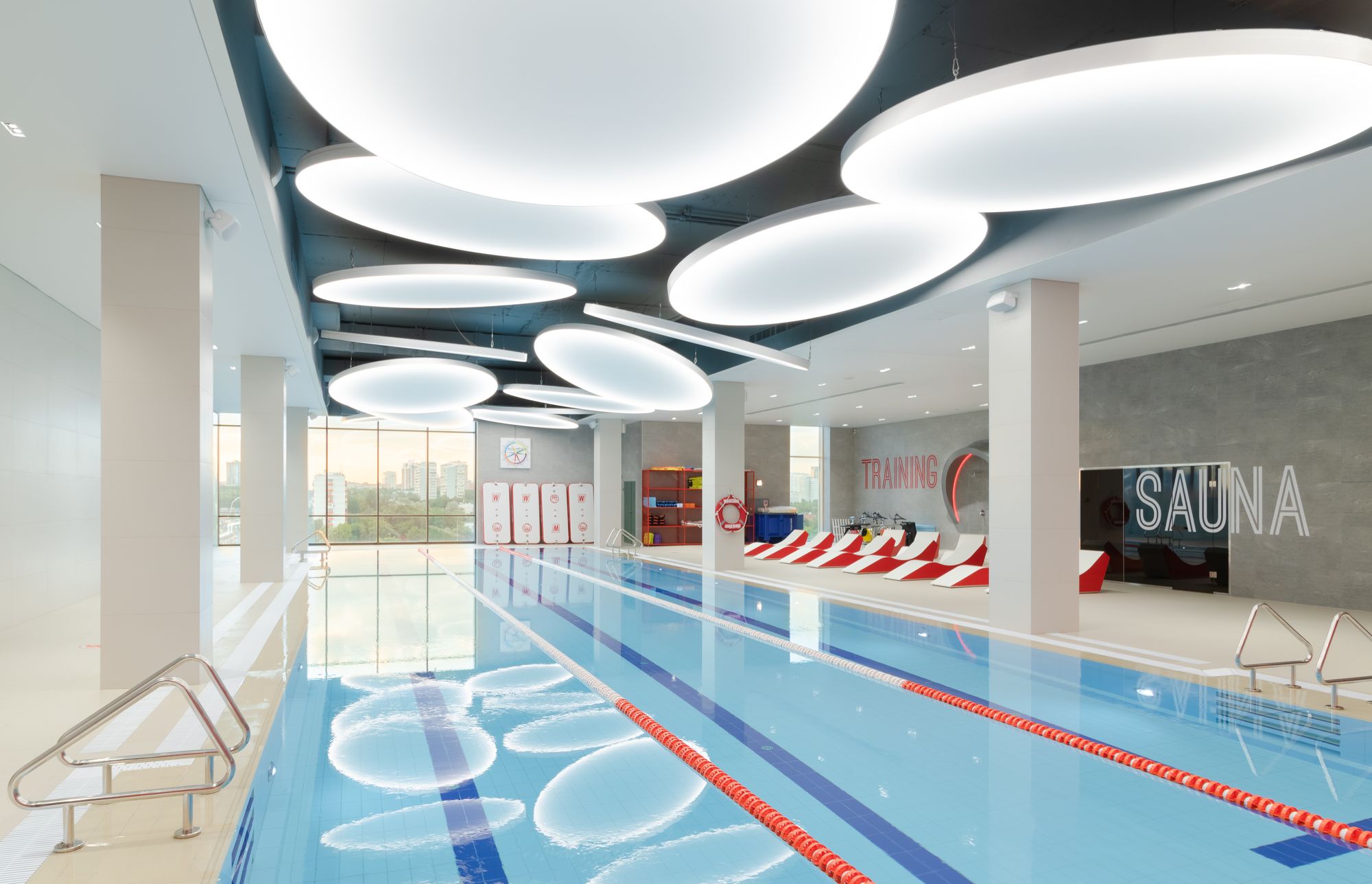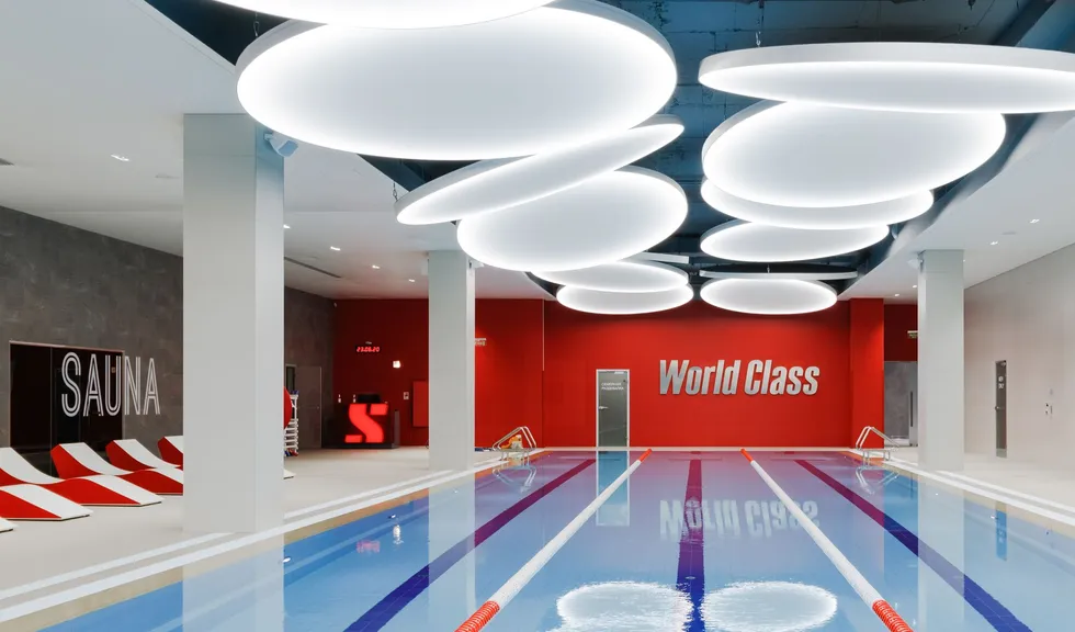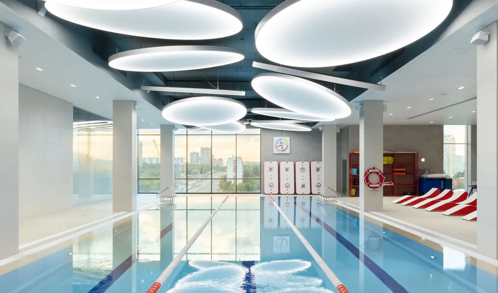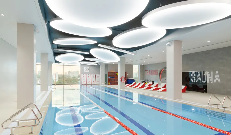 Уникальное пространство, в котором интересно сочетаются разные типы основного освещения и декоративной подсветки. Для проекта было использовано более 30 единиц светодиодного оборудования. Огромные потолочные диски светильников сочетаются с линейными и дизайнерскими подвесными светильниками. С помощью света удалось подчеркнуть масштаб, красоту и легкость интерьеров. Круглые потолочные светильники в зоне бассейна похожи на полную луну. Ломаные линии света напоминают летящие стрелы или разметку бегового стадиона. Светодизайнерам удалось создать пространство, в котором сплелись качественный белый свет и световые иллюзии.