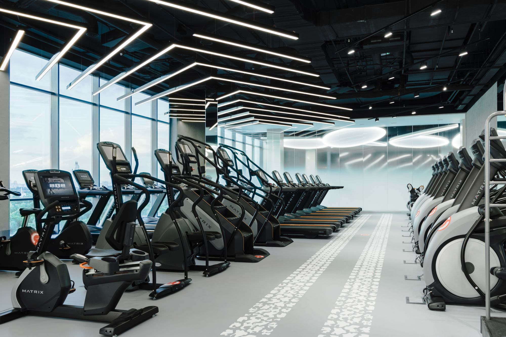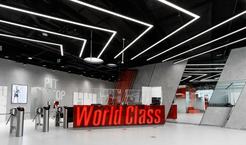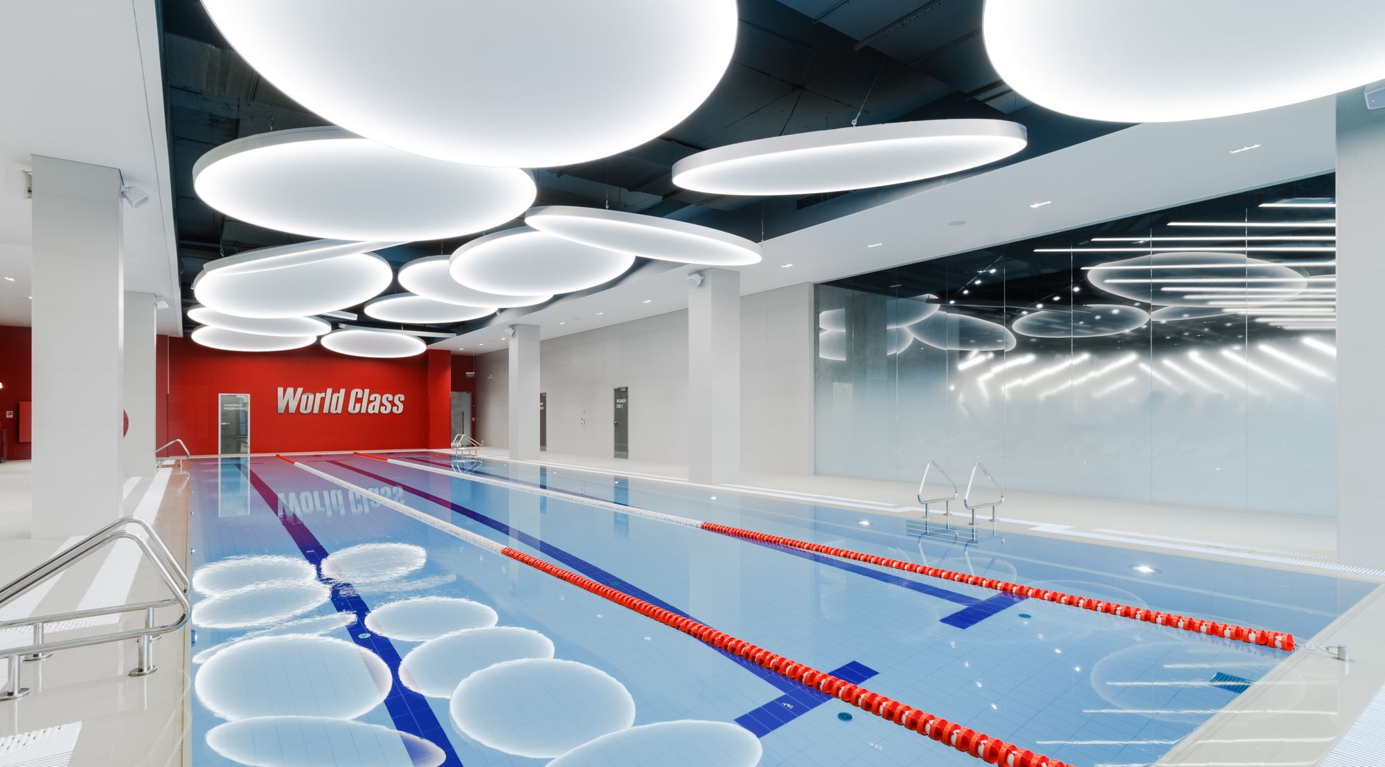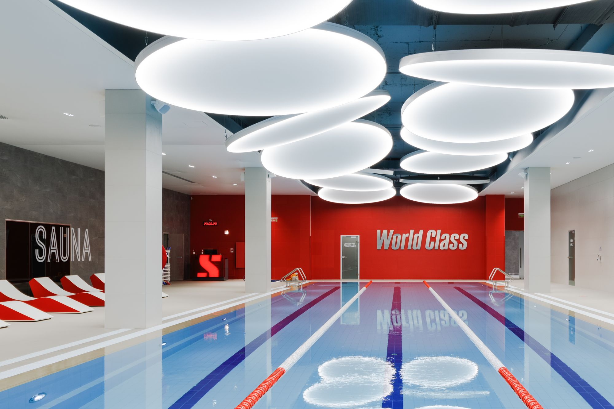 Уникальное пространство, в котором интересно сочетаются разные типы основного освещения и декоративной подсветки. Для проекта было использовано более 30 единиц светодиодного оборудования. Огромные потолочные диски светильников сочетаются с линейными и дизайнерскими подвесными светильниками. С помощью света удалось подчеркнуть масштаб, красоту и легкость интерьеров. Круглые потолочные светильники в зоне бассейна похожи на полную луну. Ломаные линии света напоминают летящие стрелы или разметку бегового стадиона. Светодизайнерам удалось создать пространство, в котором сплелись качественный белый свет и световые иллюзии.