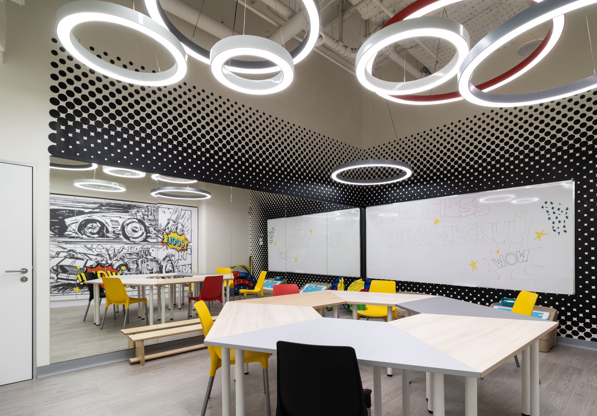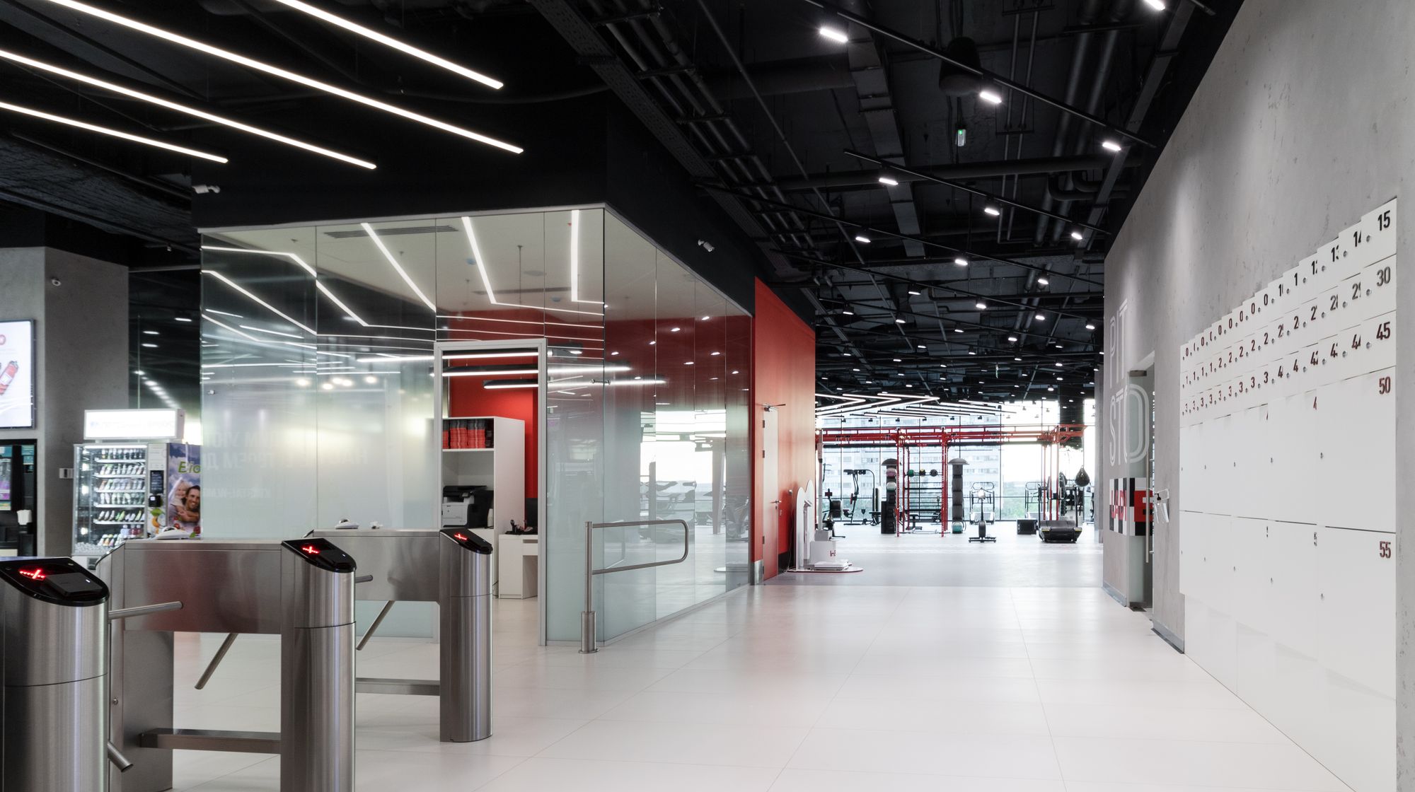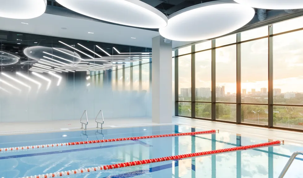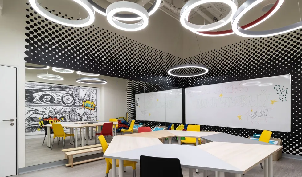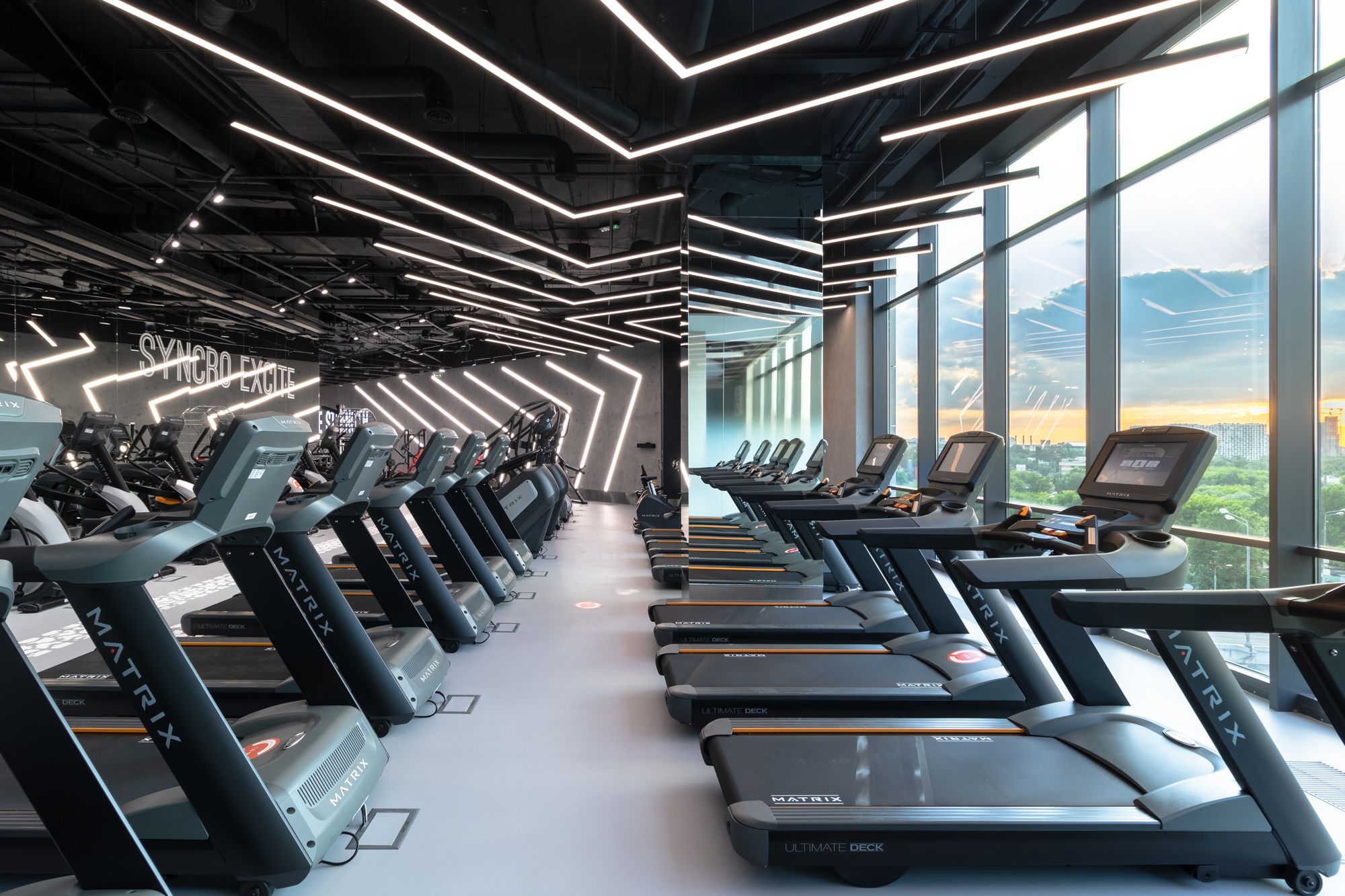 Уникальное пространство, в котором интересно сочетаются разные типы основного освещения и декоративной подсветки. Для проекта было использовано более 30 единиц светодиодного оборудования. Огромные потолочные диски светильников сочетаются с линейными и дизайнерскими подвесными светильниками. С помощью света удалось подчеркнуть масштаб, красоту и легкость интерьеров. Круглые потолочные светильники в зоне бассейна похожи на полную луну. Ломаные линии света напоминают летящие стрелы или разметку бегового стадиона. Светодизайнерам удалось создать пространство, в котором сплелись качественный белый свет и световые иллюзии.