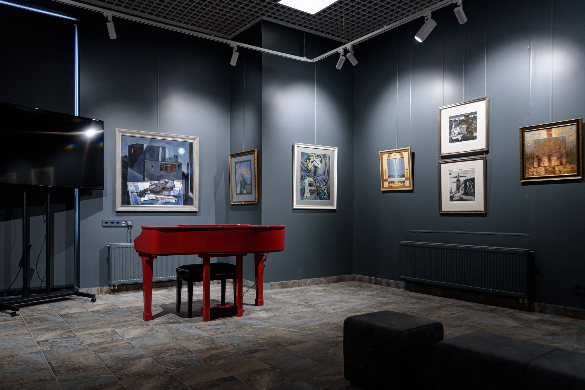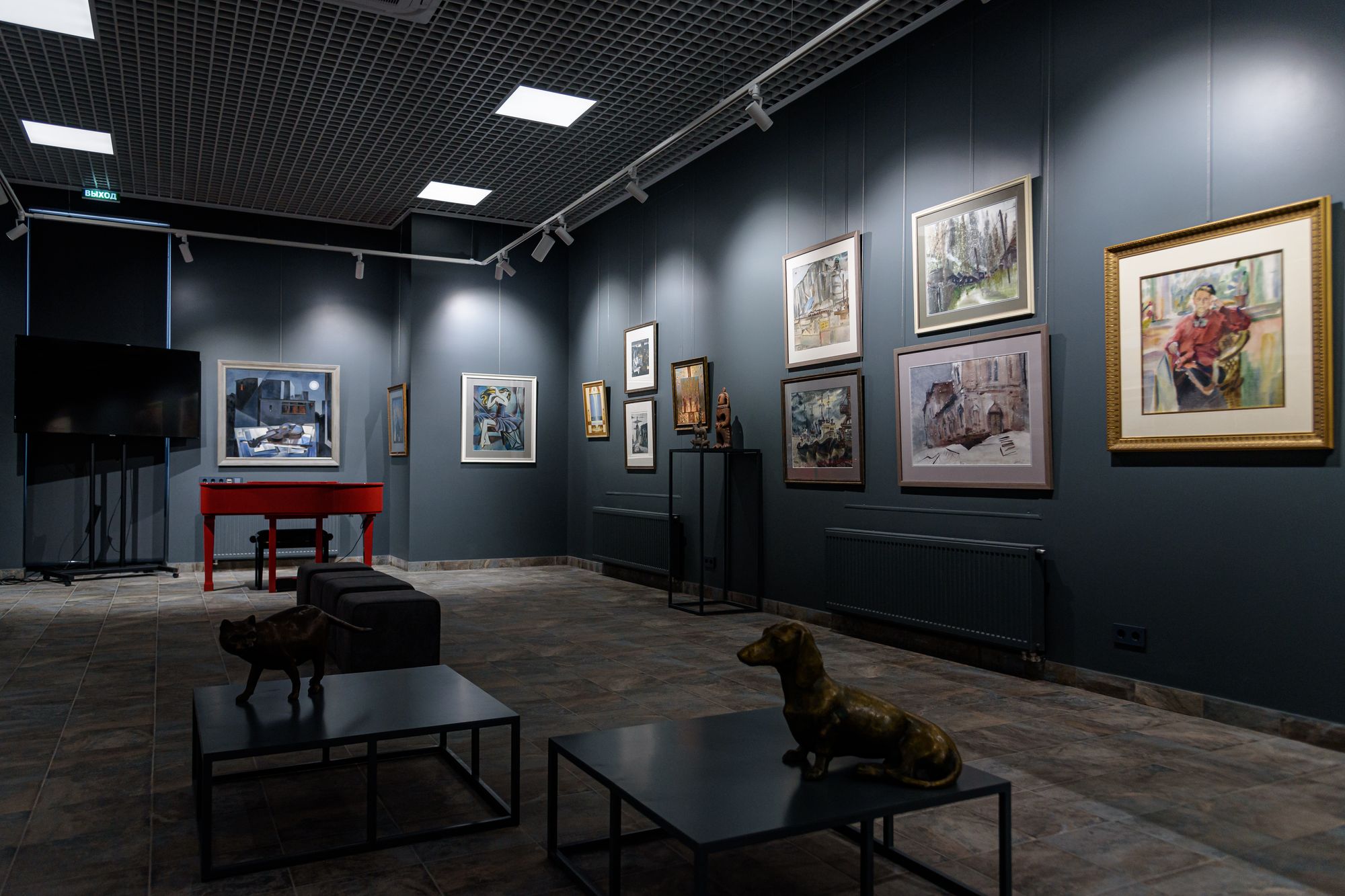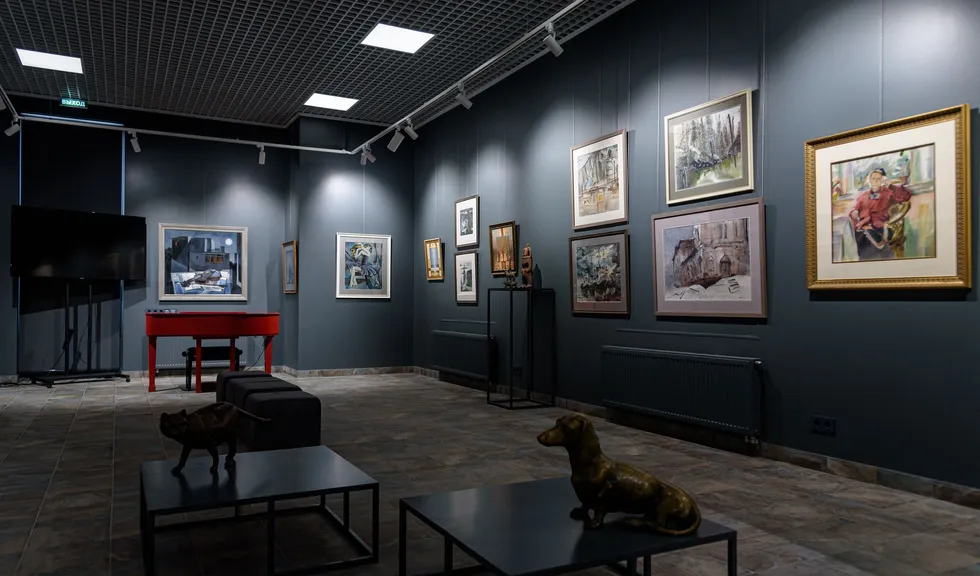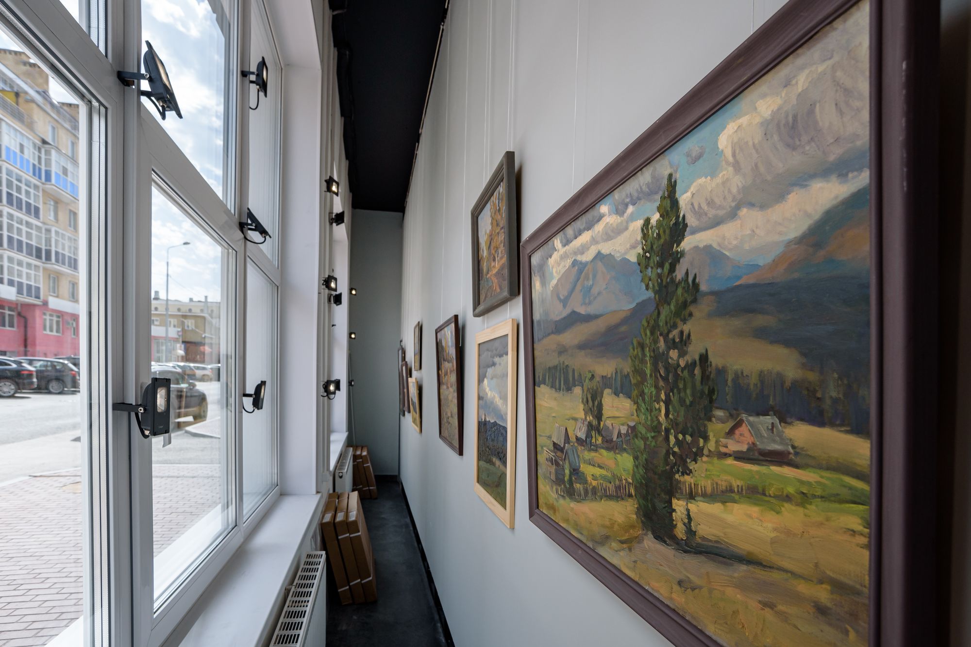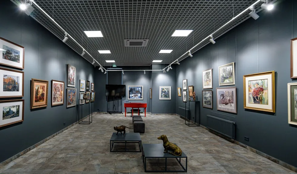 Особенностью проекта является многофункциональность: в рамках единого пространства было необходимо создать комфортную и удобную световую среду для проведения любых мероприятий, презентаций и выставок. Дизайнерская задумка реализована с помощью трековых светильников с регулируемым углом излучения. Основная потолочная подсветка создана с помощью светодиодных панелей с изменяемой цветовой температурой. В выставочных помещениях важна быстрая смена световых акцентов, поэтому трековые светильники, которые свободно перемещаются вдоль шины — идеальное решение. Для подсветки внешних оконных витрин используются накладные прожекторы, создающие оригинальную декоративную подсветку картин.