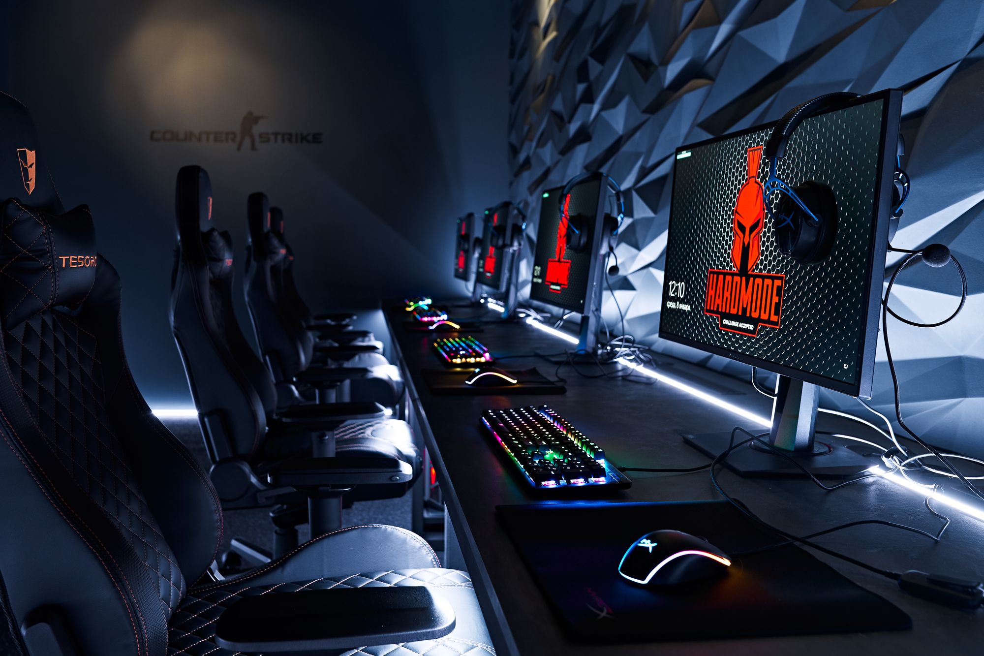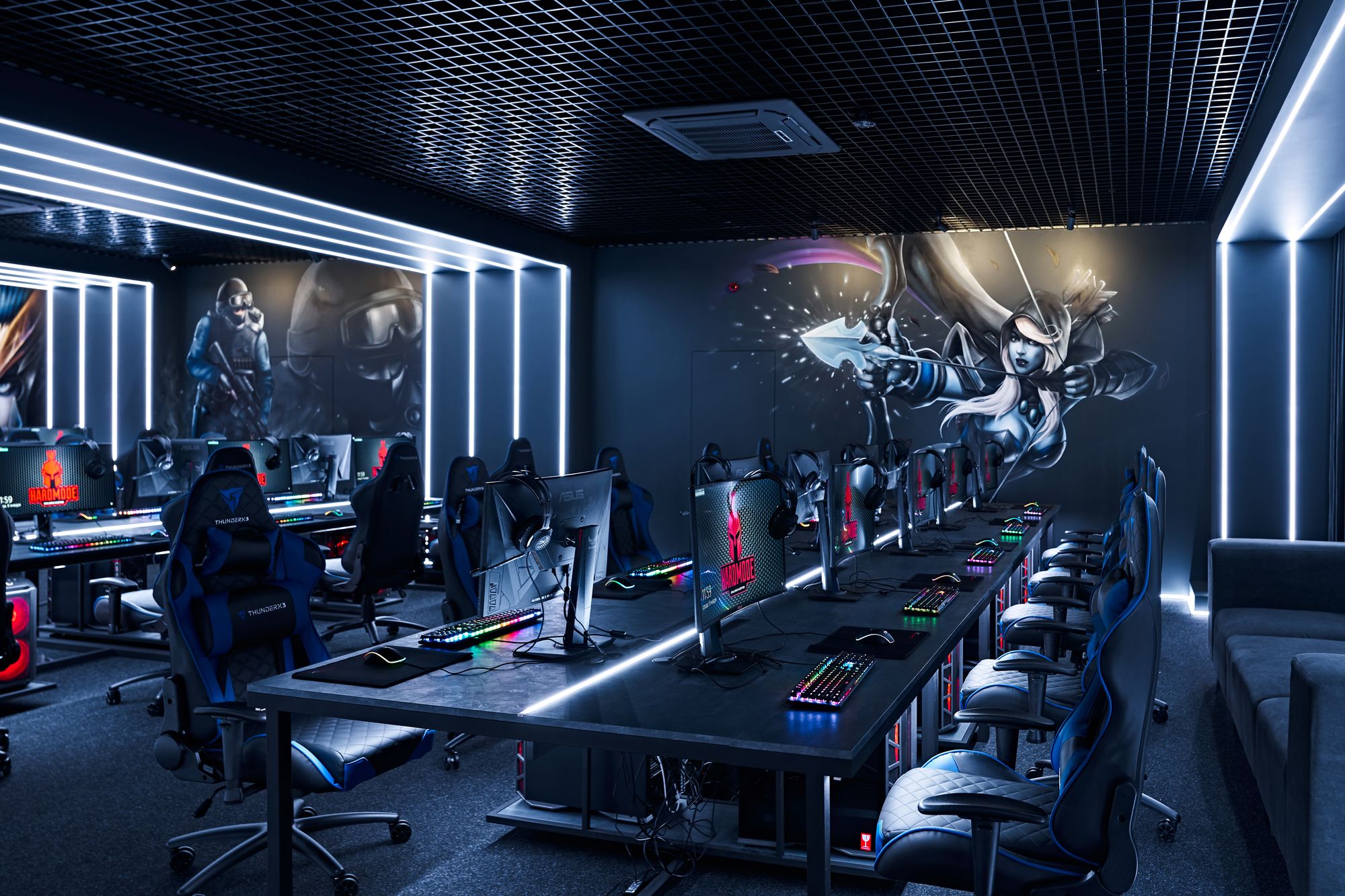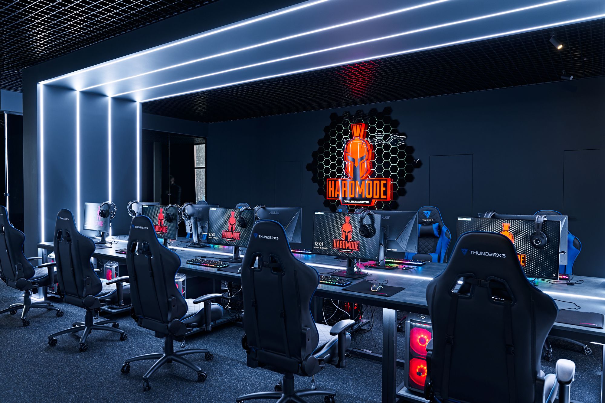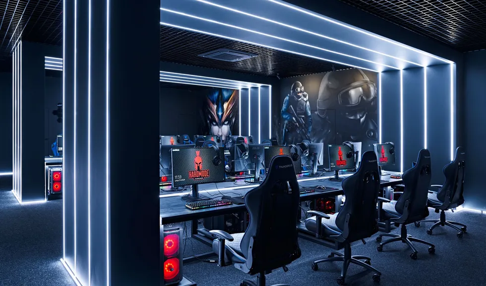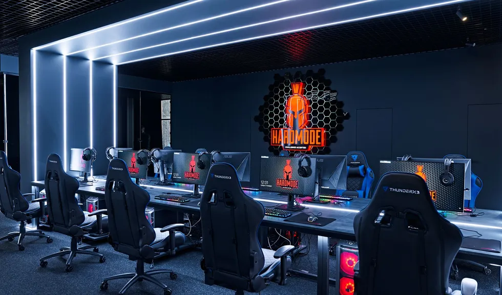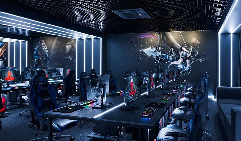 Световые линии интегрированы в стены, потолок и столы. Многоцветная RGB-лента, размещенная в компьютерных столах, управляется контроллером. Полосы света, которые плавно переходят со стен на потолок, напоминают портал, переносящий из реальности в параллельный мир. Игра контрастов впечатляет: темное помещение, яркие световые полосы и масштабные подсвеченные граффити на стенах. Персонажи игр словно находятся в движении за счет грамотно подобранных световых акцентов. Все пространство превращается в настоящую игровую арену, которая объединяет профессионалов и любителей киберспорта.