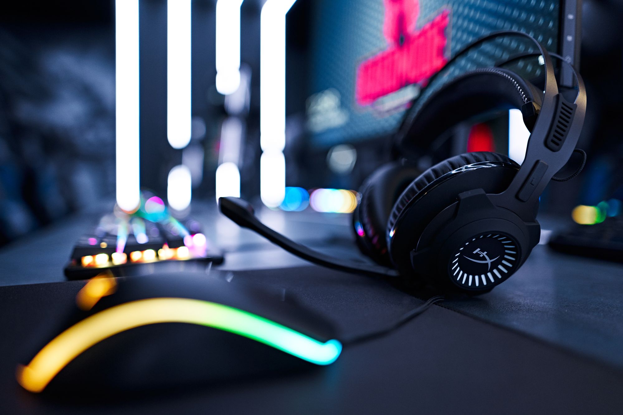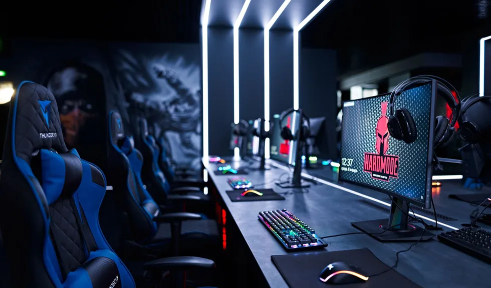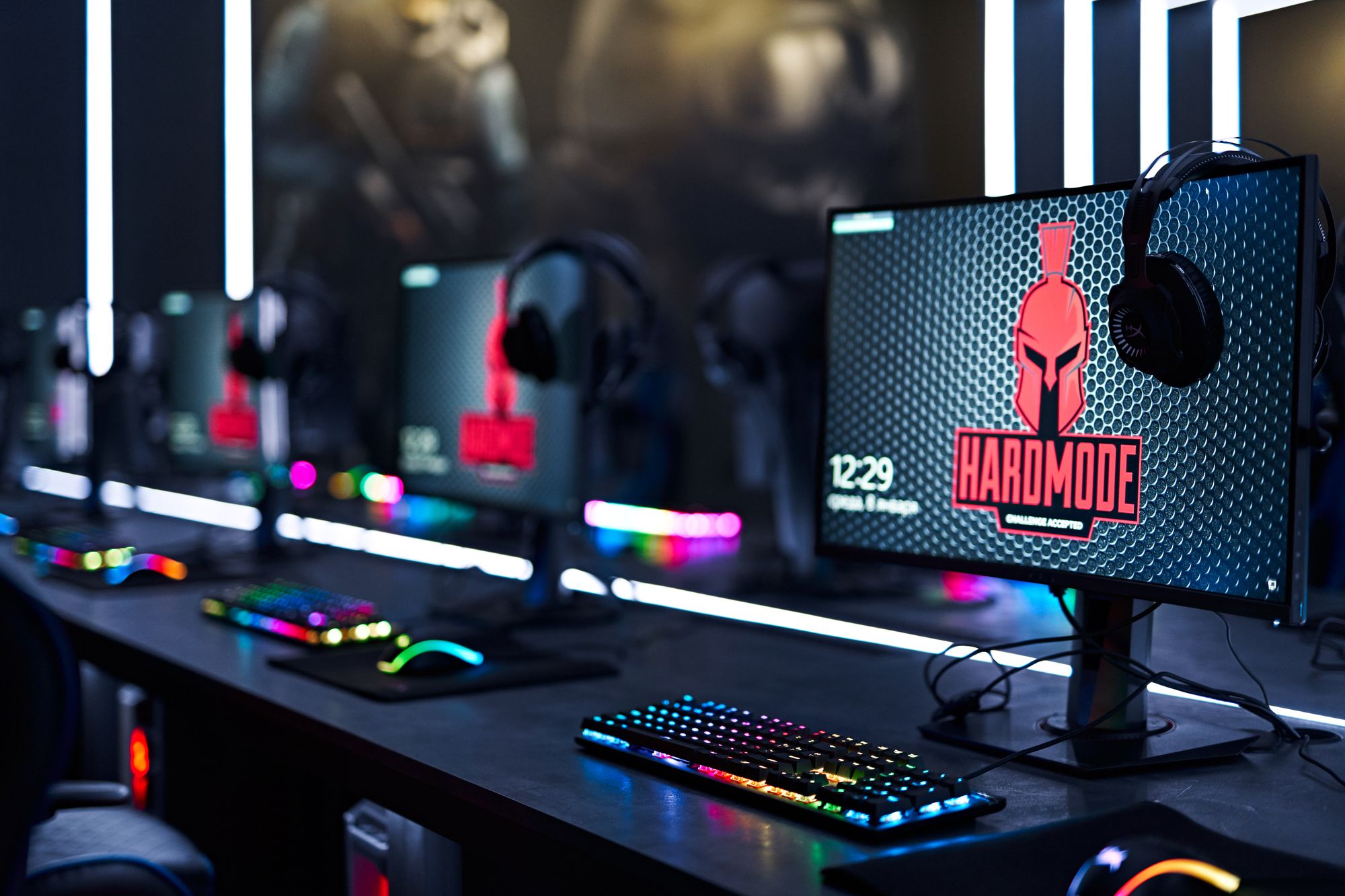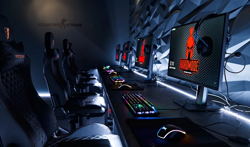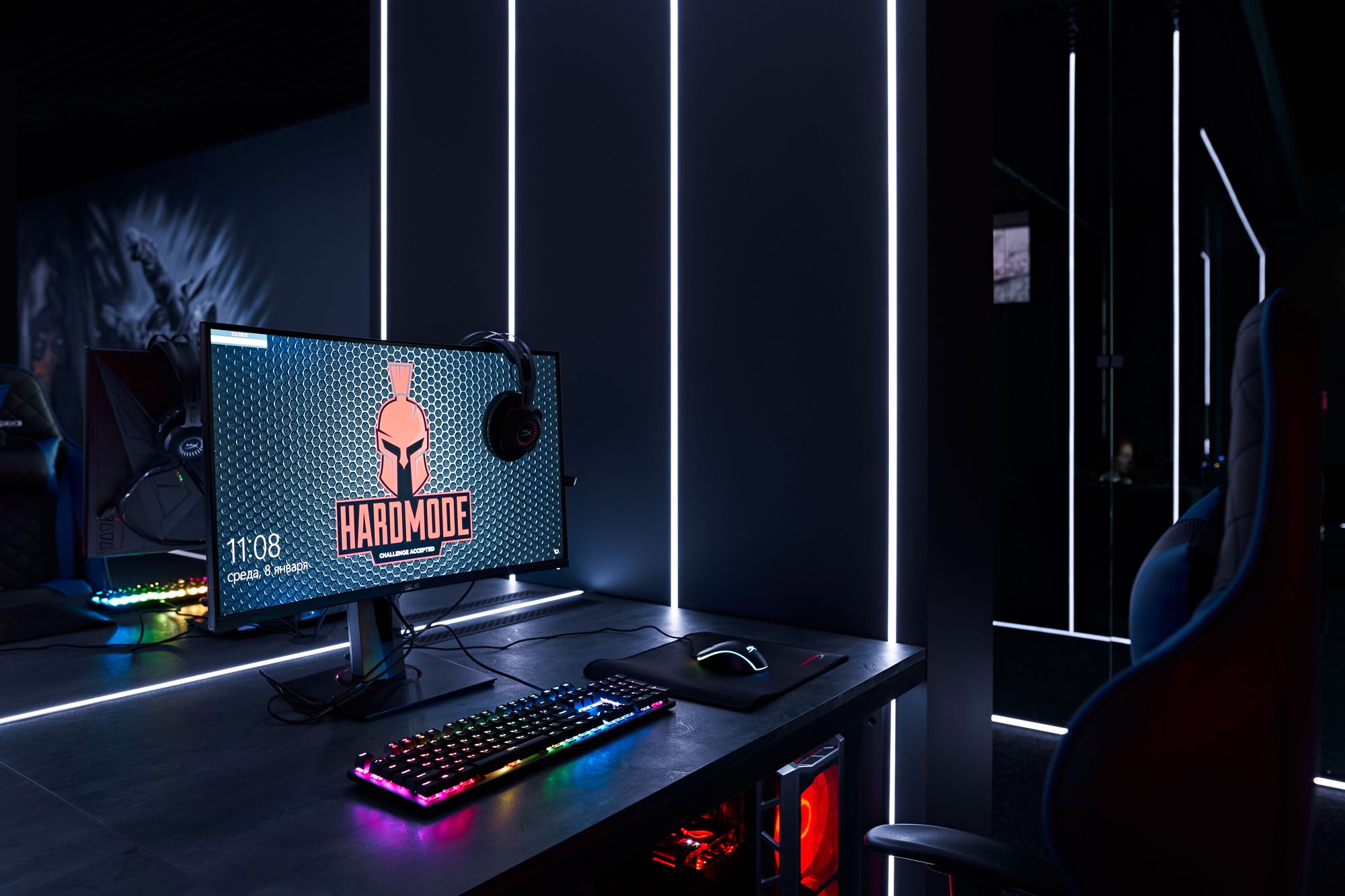 Световые линии интегрированы в стены, потолок и столы. Многоцветная RGB-лента, размещенная в компьютерных столах, управляется контроллером. Полосы света, которые плавно переходят со стен на потолок, напоминают портал, переносящий из реальности в параллельный мир. Игра контрастов впечатляет: темное помещение, яркие световые полосы и масштабные подсвеченные граффити на стенах. Персонажи игр словно находятся в движении за счет грамотно подобранных световых акцентов. Все пространство превращается в настоящую игровую арену, которая объединяет профессионалов и любителей киберспорта.