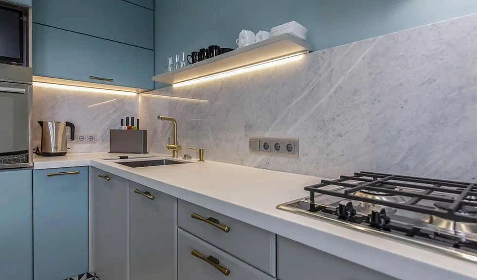 При подсветке рабочей зоны необходимо было создать яркое и, одновременно, мягкое освещение. Кроме того, минимальное количество шкафов и полок над рабочей поверхностью требовали максимально незаметных светильников.