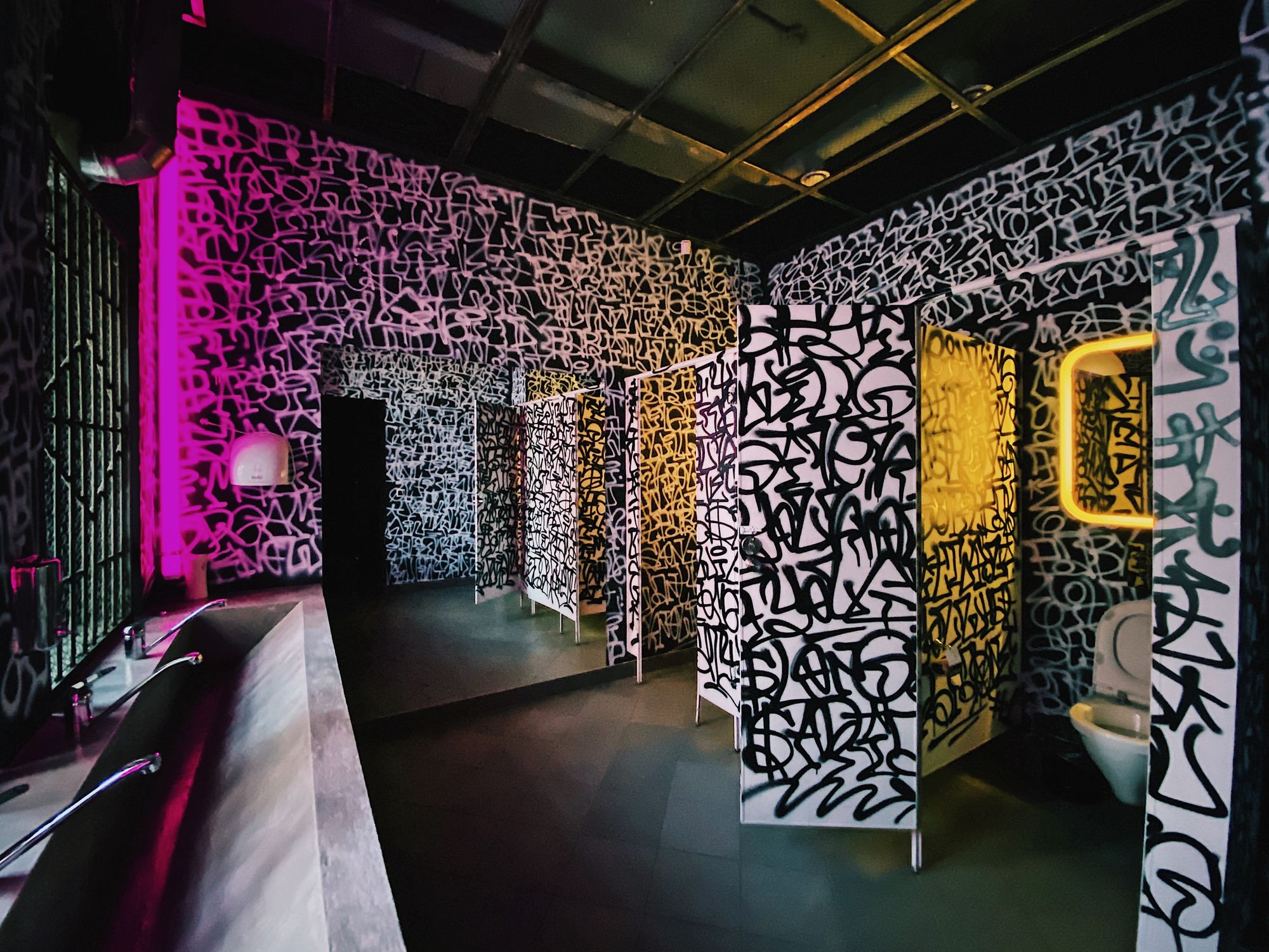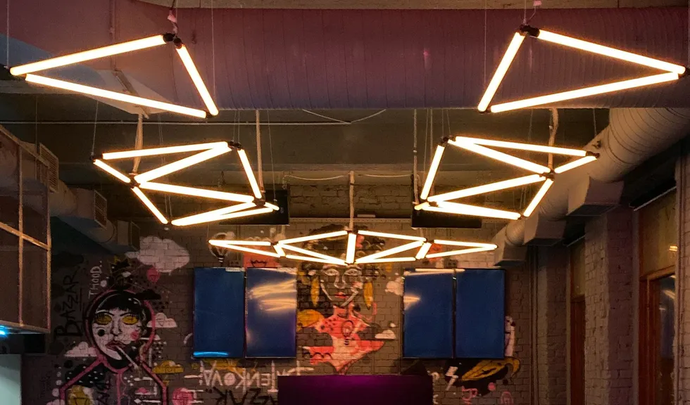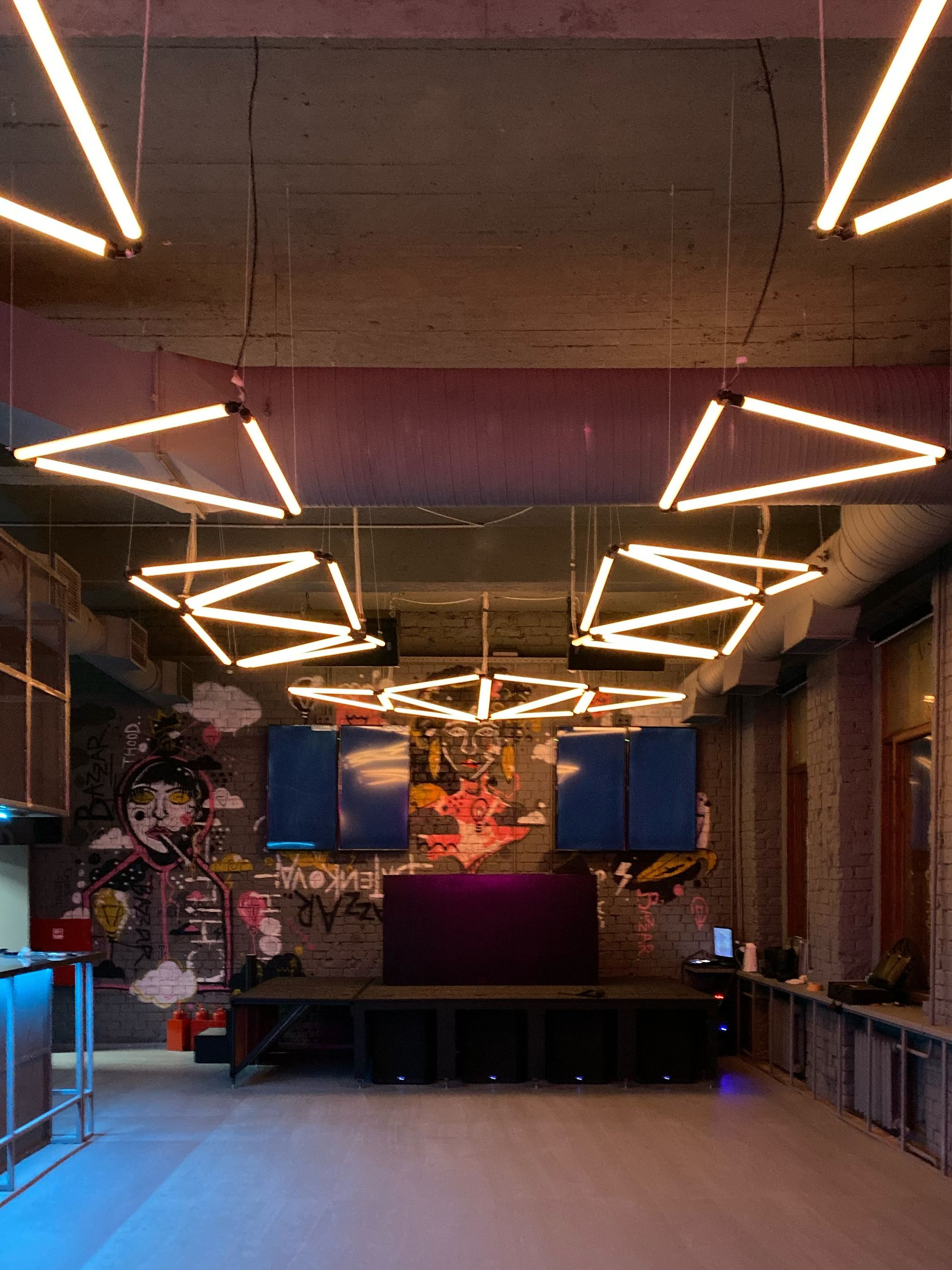 С помощью световых инсталляций в клубе воссоздана невероятная атмосфера ночного города. Фактурность кирпичных стен подчеркнута световыми линиями разных цветов. Помещения, оформленные в стиле стрит-арт, напоминают тусовочные улицы европейских городов. В рамках проекта создано динамическое освещение с возможностью смены цвета свечения лент с помощью RGB-контроллера. Использование простых подвесных линейных светильников добавляет пространству четкой геометрии.