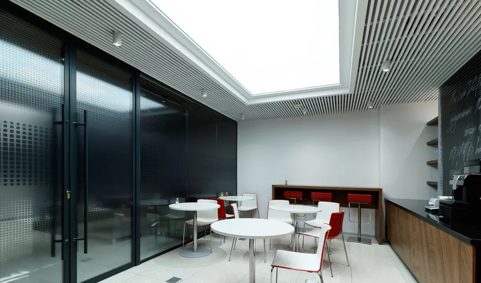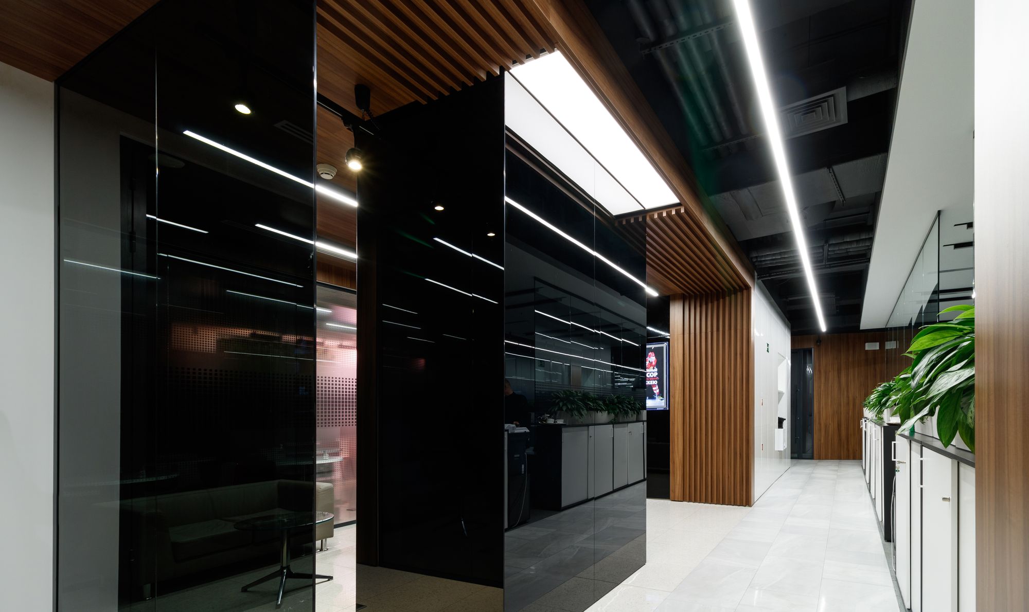В качестве центрального элемента и основного освещения выступает большое прямоугольное полотно натяжного потолка, подсвеченное светодиодной лентой. Декоративным элементом является яркая световая полоса, которая отражается в зеркальных стенах и глянцевом потолке. За счет использования ярких световых акцентов помещение кажется более объемным.
