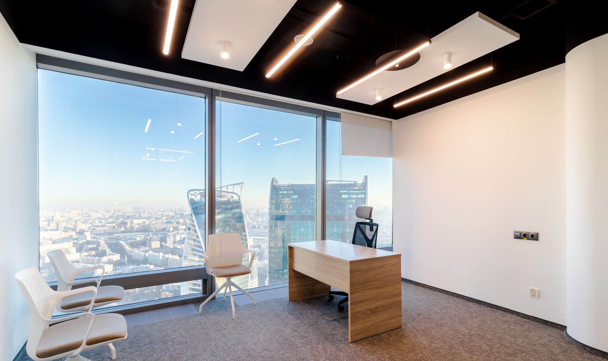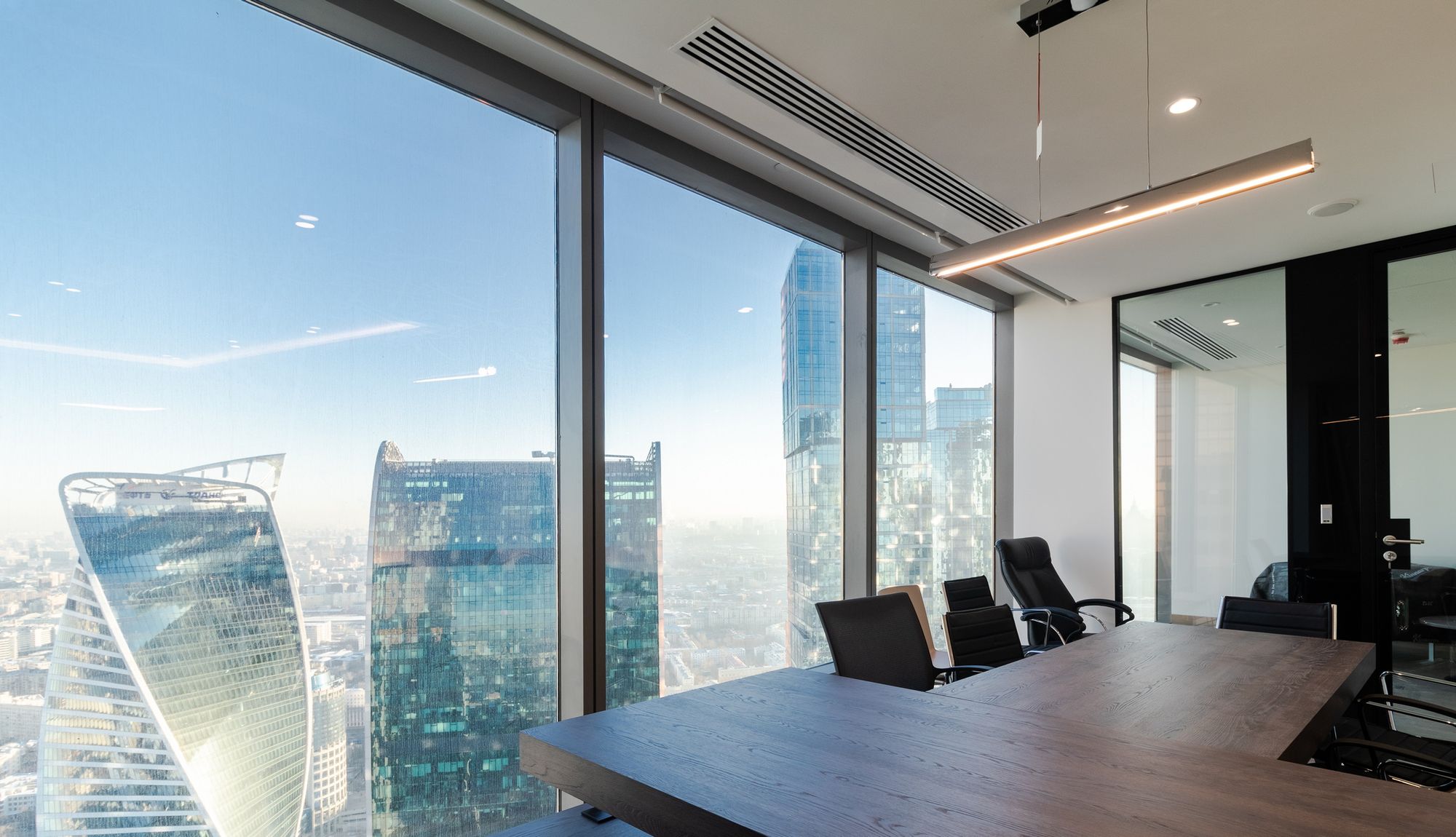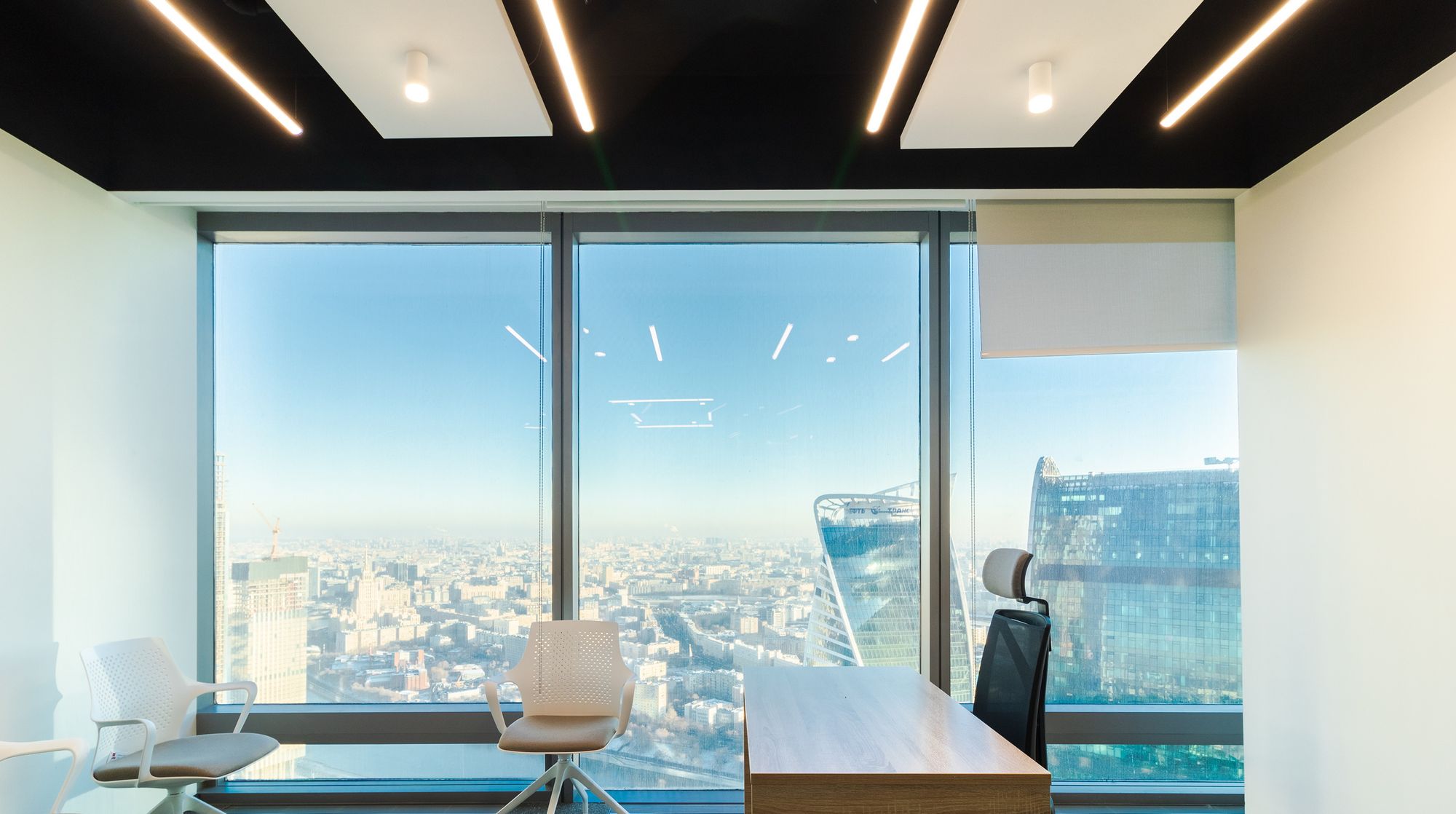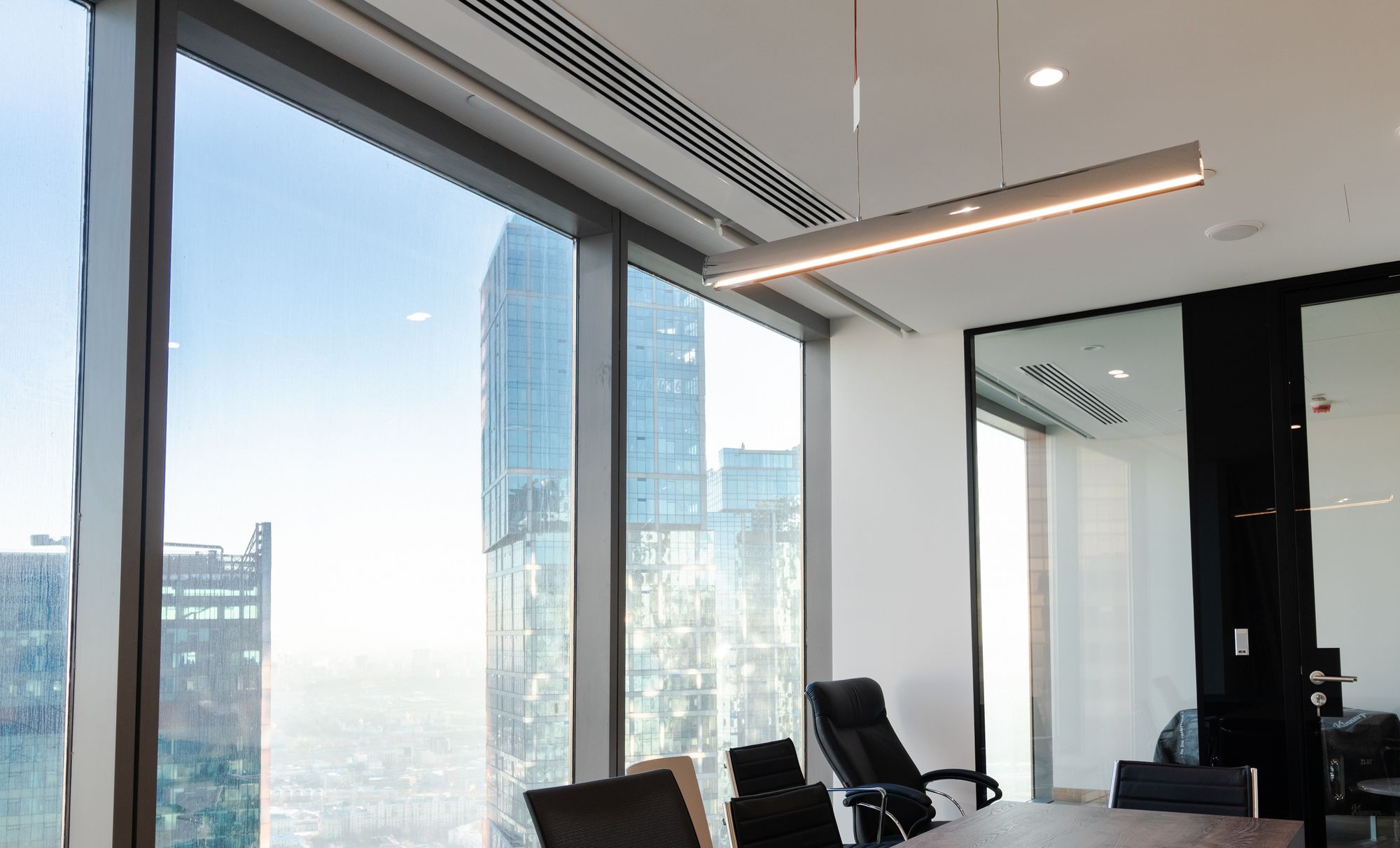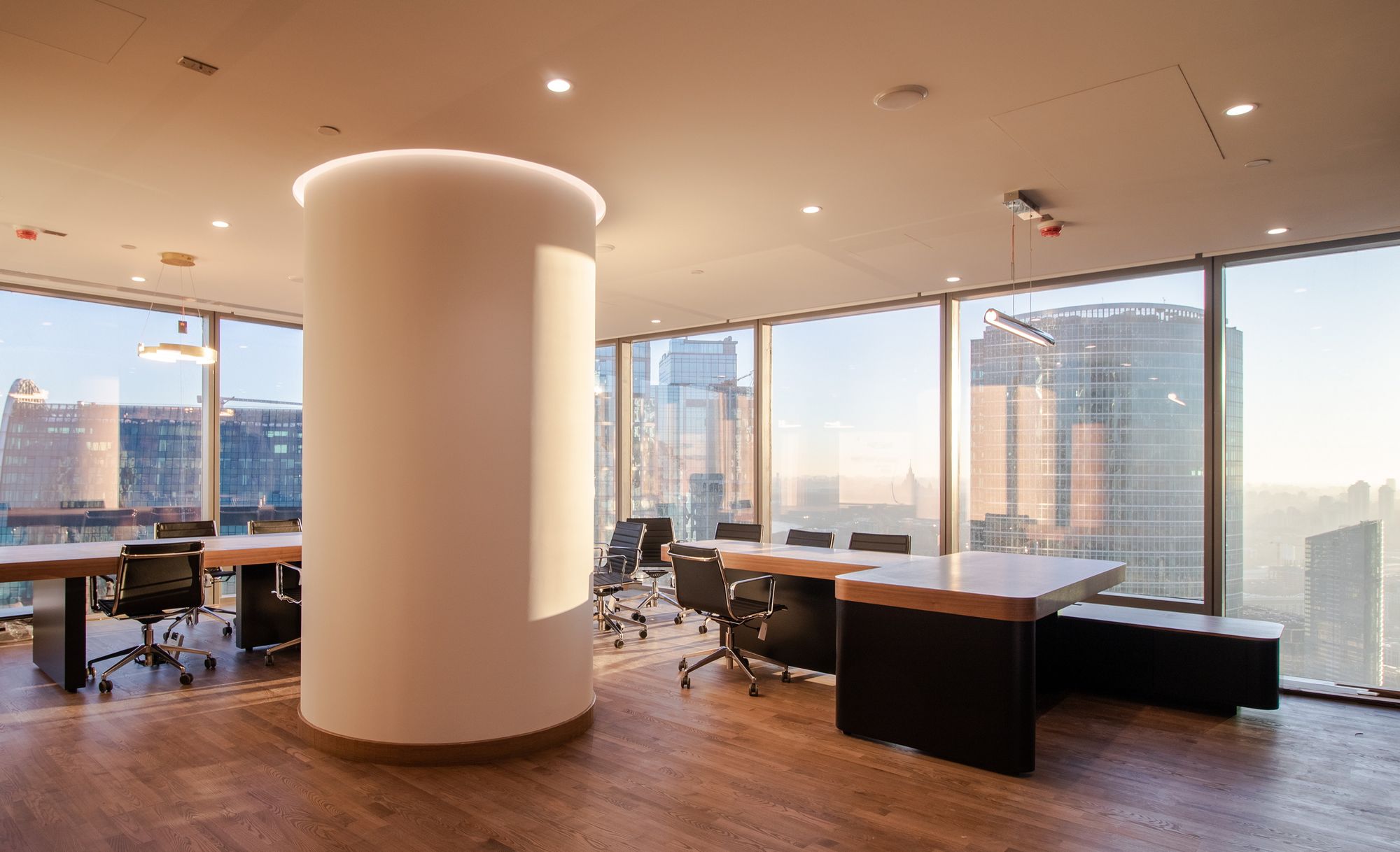 Современный офис с панорамным видом на Москву превратился в уникальное световое пространство. Основным элементом оформления стали подвесные линейные светильники на тросах, при создании которых использовали профиль круглого сечения с матовым экраном. Подвесные светильники не только создают комфортное основное освещение, но и являются дизайнерскими объектами. Для разных зон офиса выбраны разные оттенки белого: теплый белый располагает к комфортному общению, а дневной настраивает на активную работу в течение всего дня. В коридоре использовали встроенные линии света с лентами на черной плате — они очень эффектно смотрятся в помещениях с темными стенами и не выделяются на их фоне. Стильные и оригинальные светильники в виде колец собраны из профилей и широкой светодиодной ленты. В деревянные перегородки заложили линии света, подчеркнув благородную текстуру натурального дерева.