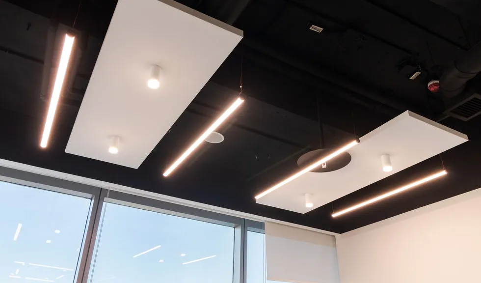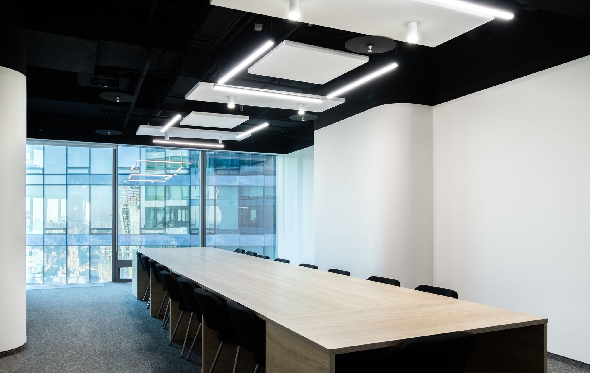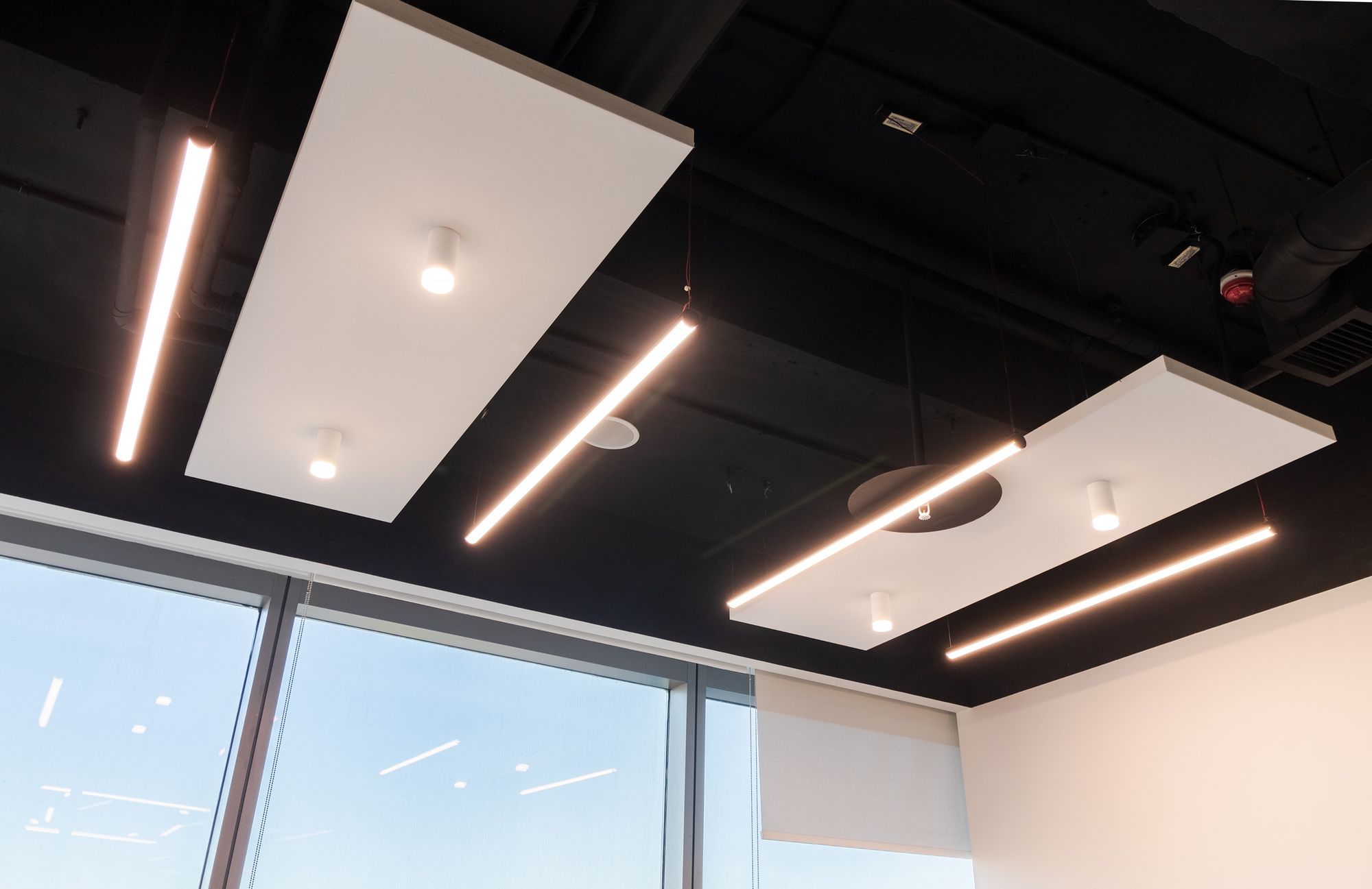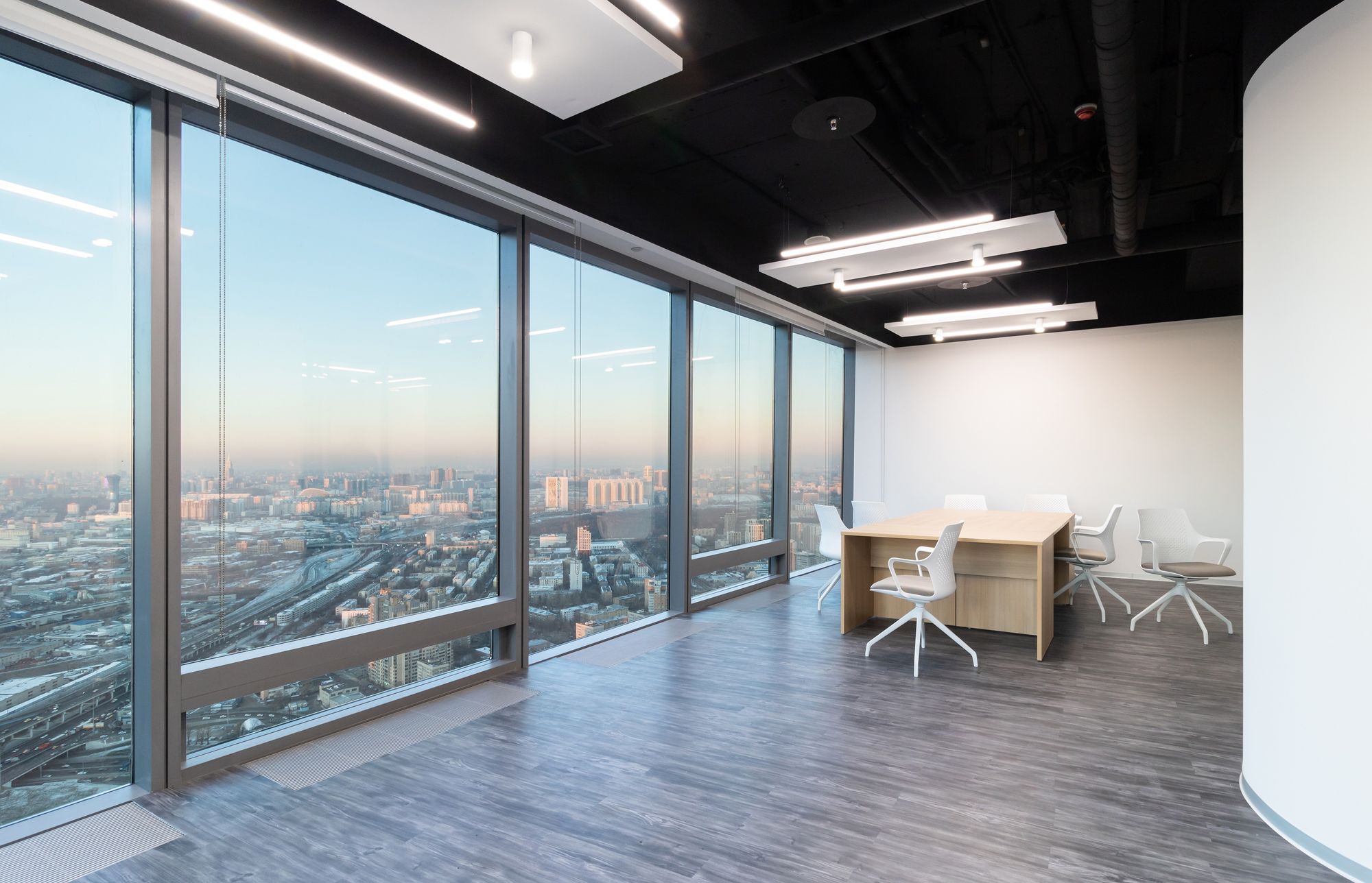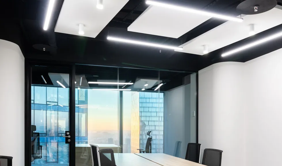 Современный офис с панорамным видом на Москву превратился в уникальное световое пространство. Основным элементом оформления стали подвесные линейные светильники на тросах, при создании которых использовали профиль круглого сечения с матовым экраном. Подвесные светильники не только создают комфортное основное освещение, но и являются дизайнерскими объектами. Для разных зон офиса выбраны разные оттенки белого: теплый белый располагает к комфортному общению, а дневной настраивает на активную работу в течение всего дня. В коридоре использовали встроенные линии света с лентами на черной плате — они очень эффектно смотрятся в помещениях с темными стенами и не выделяются на их фоне. Стильные и оригинальные светильники в виде колец собраны из профилей и широкой светодиодной ленты. В деревянные перегородки заложили линии света, подчеркнув благородную текстуру натурального дерева.
