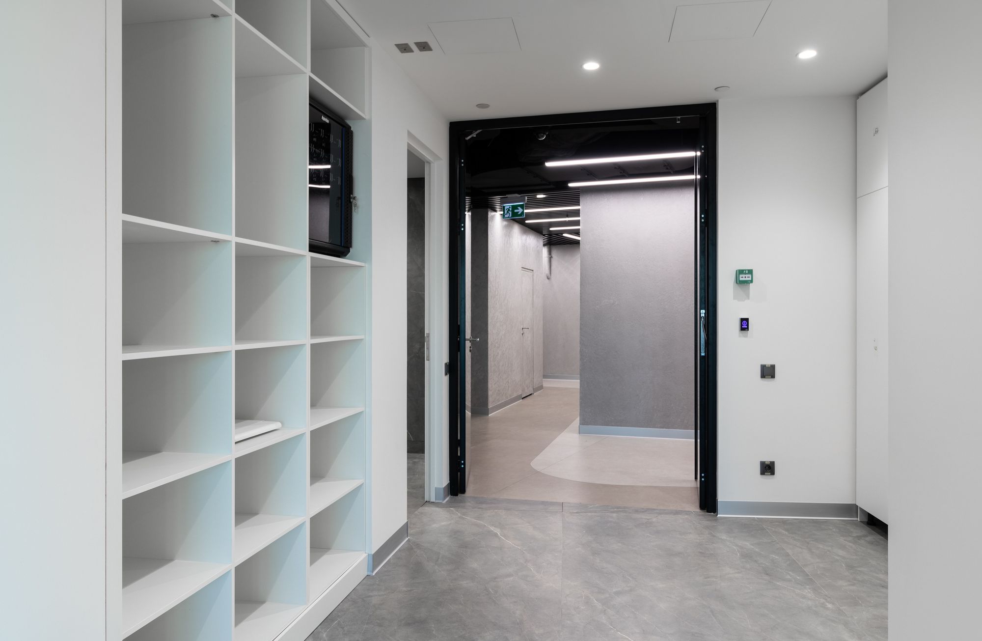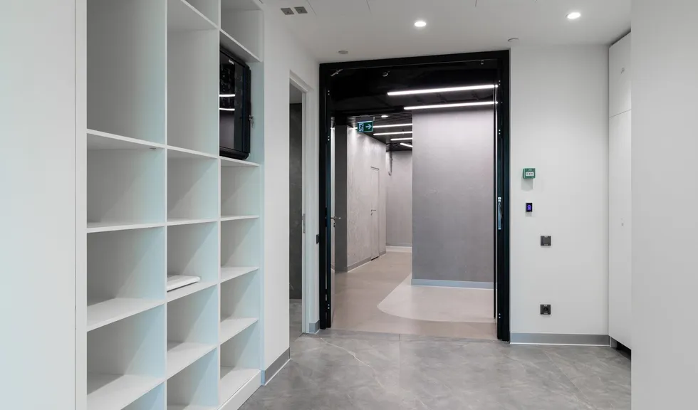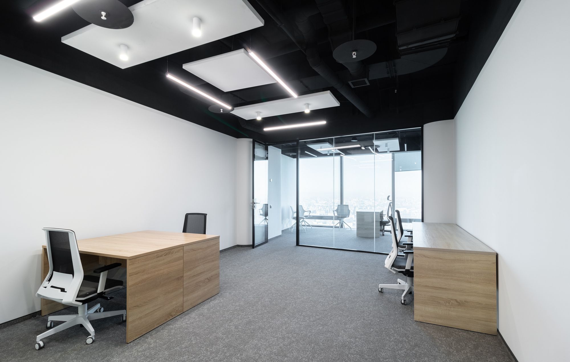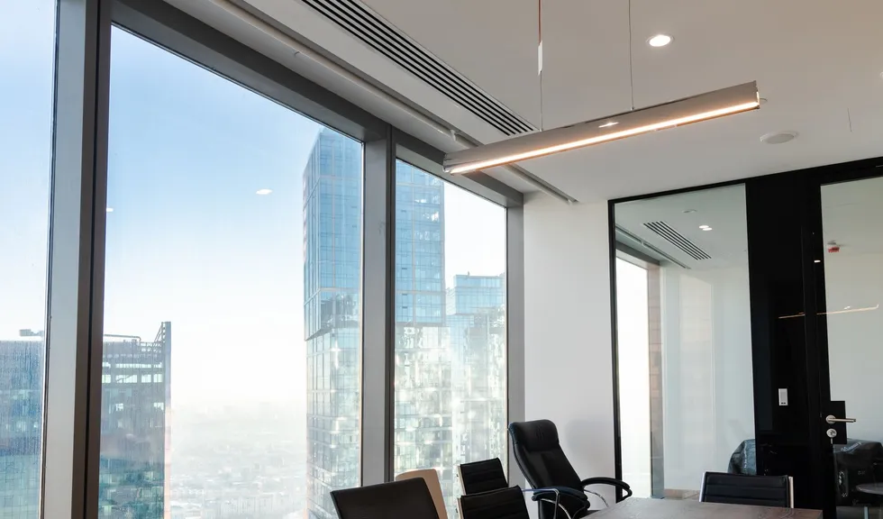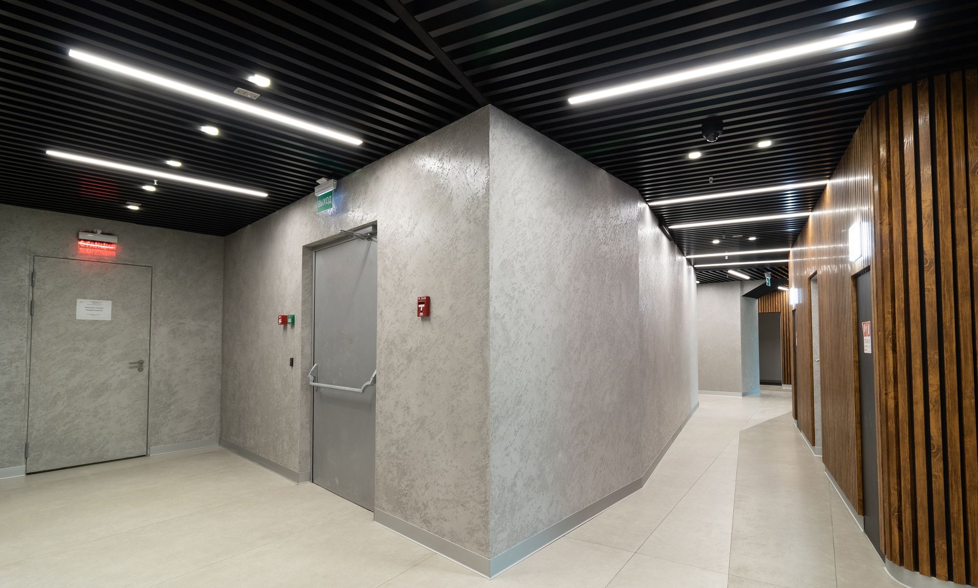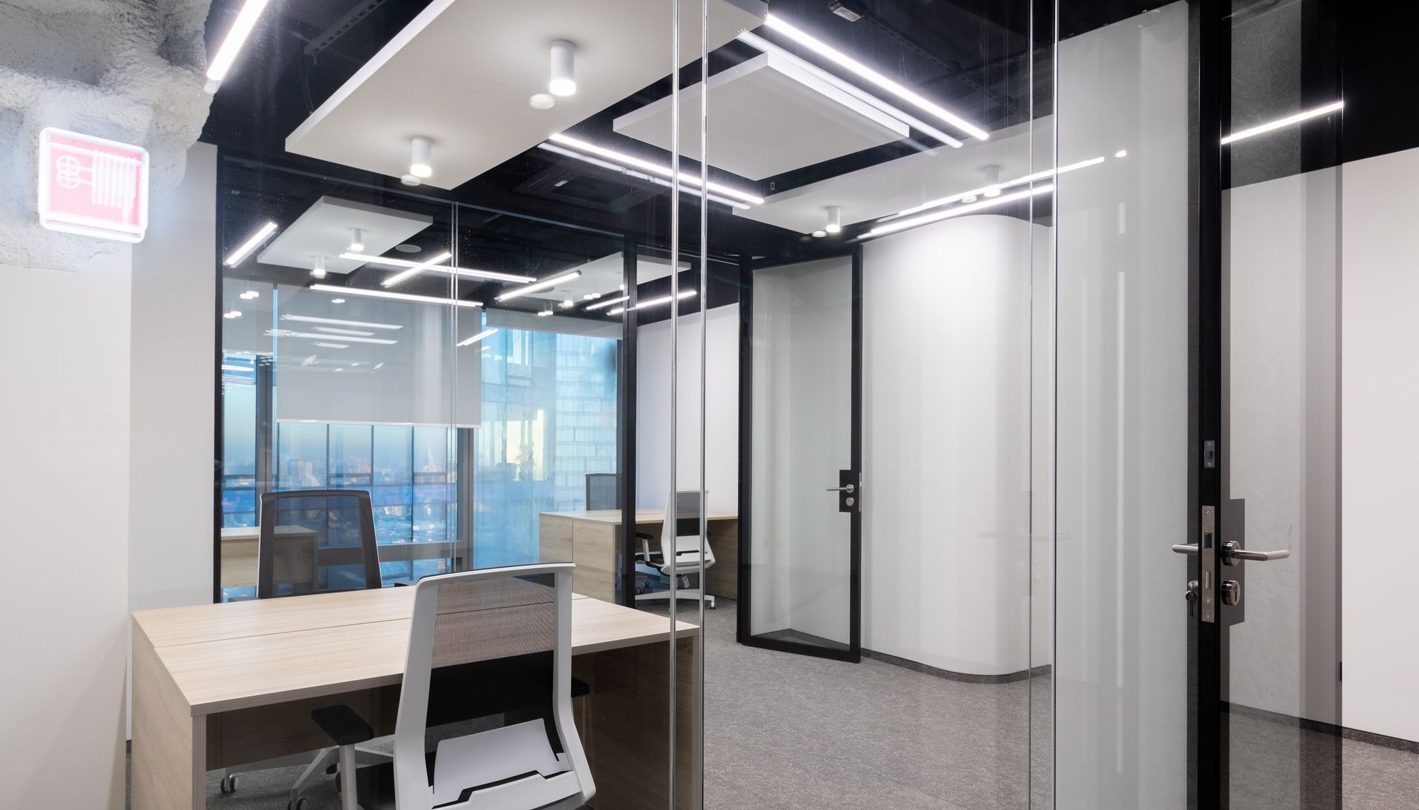 Современный офис с панорамным видом на Москву превратился в уникальное световое пространство. Основным элементом оформления стали подвесные линейные светильники на тросах, при создании которых использовали профиль круглого сечения с матовым экраном. Подвесные светильники не только создают комфортное основное освещение, но и являются дизайнерскими объектами. Для разных зон офиса выбраны разные оттенки белого: теплый белый располагает к комфортному общению, а дневной настраивает на активную работу в течение всего дня. В коридоре использовали встроенные линии света с лентами на черной плате — они очень эффектно смотрятся в помещениях с темными стенами и не выделяются на их фоне. Стильные и оригинальные светильники в виде колец собраны из профилей и широкой светодиодной ленты. В деревянные перегородки заложили линии света, подчеркнув благородную текстуру натурального дерева.
