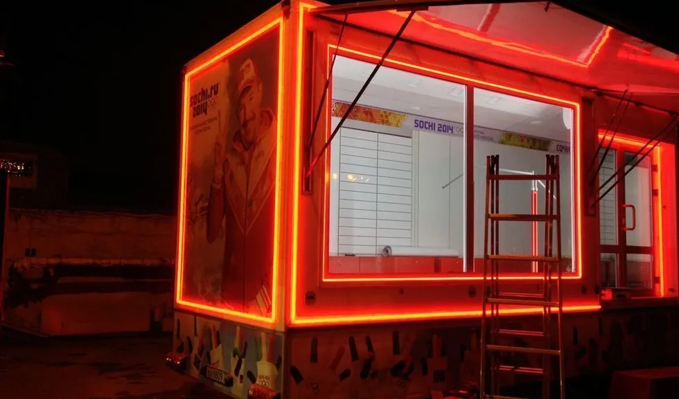 Светодиодная подсветка была установлена на тягач и прицеп, в котором оборудован магазин товаров с символикой Олимпийских игр Сочи 2014. Снаружи прицеп был выделен контурной подсветкой, выполненной при помощи светодиодной ленты arlight®. Светодиодная лента установлена в алюминиевый профиль arlight® с матовым экраном, создающим эффект сплошной световой линии.