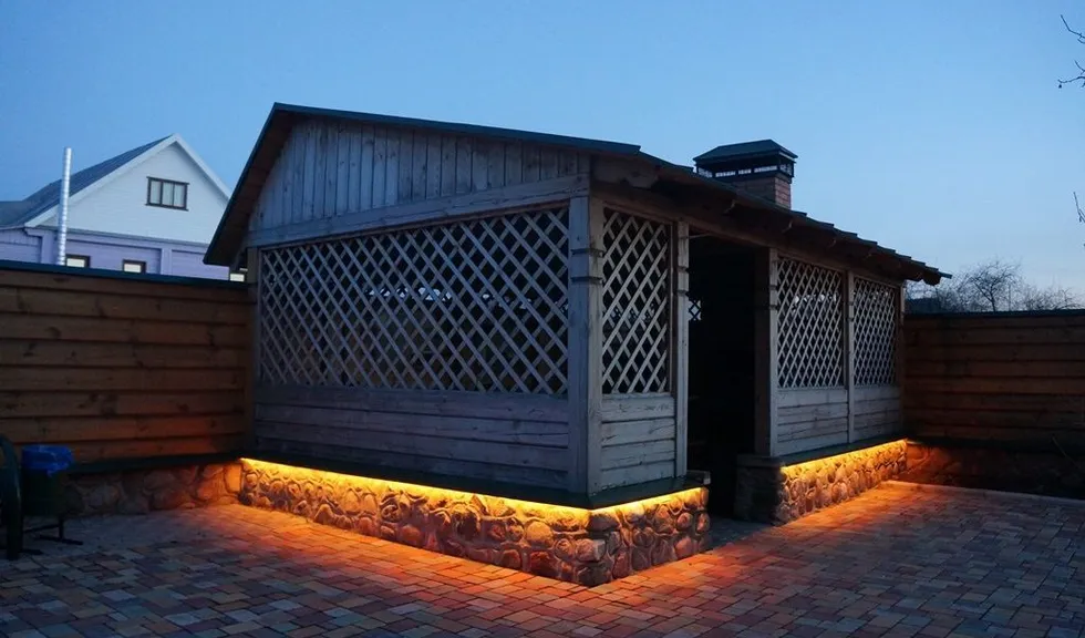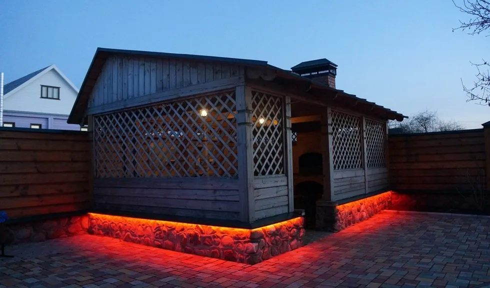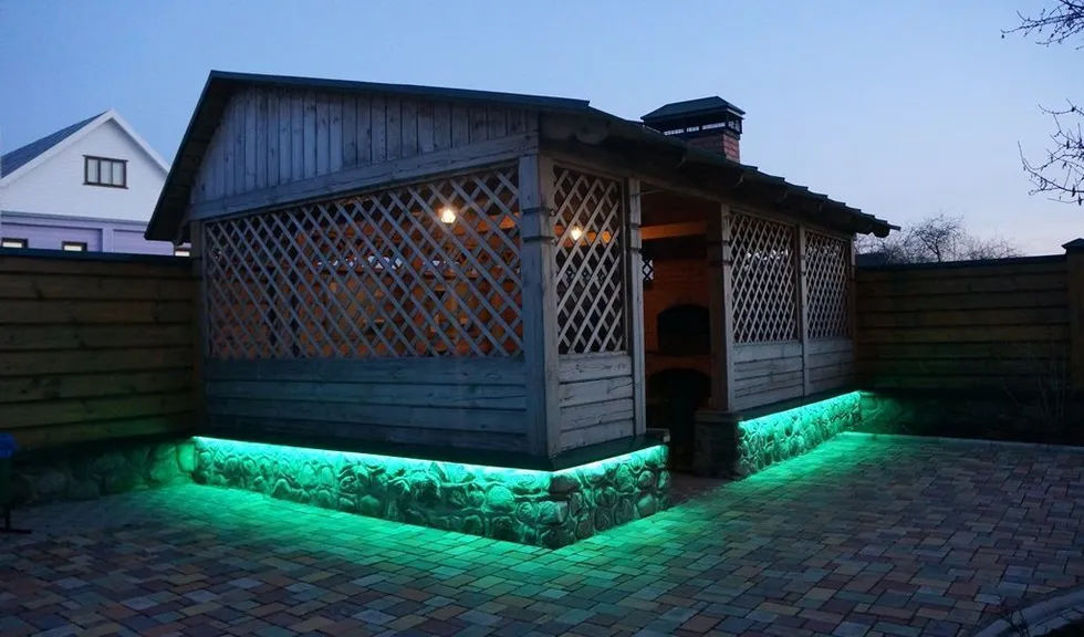 Простая подсветка фасада многоцветной светодиодной лентой RGB от компании arlight® в разы улучшила вид простой загородной беседки.