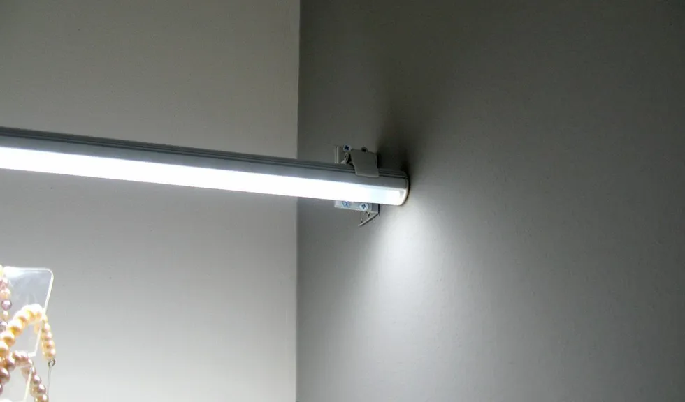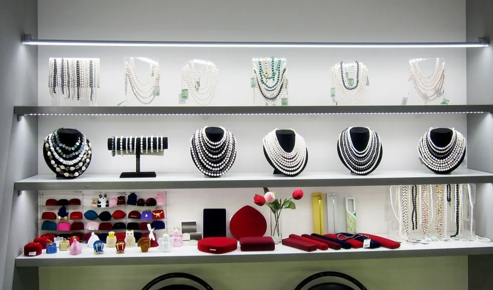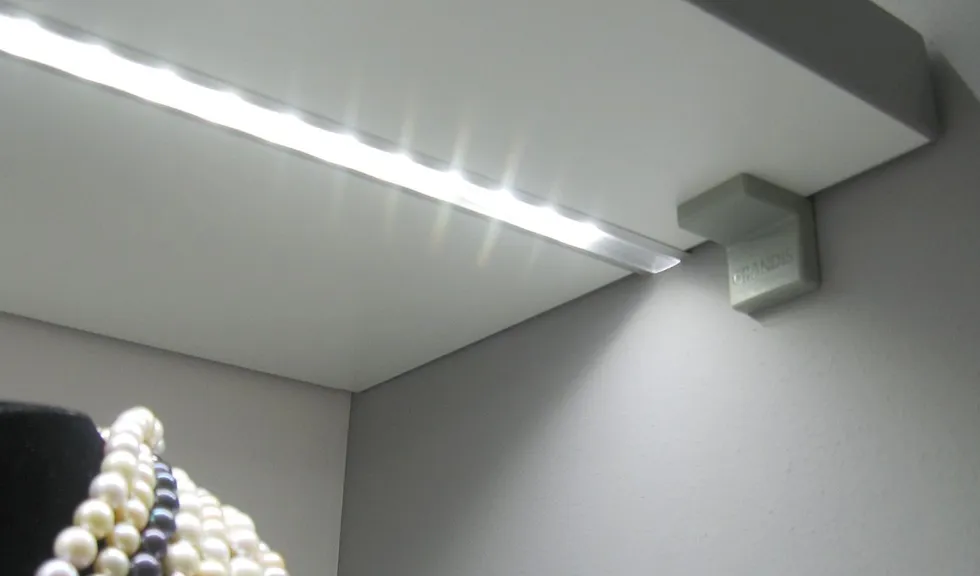 А самое интересное - подсветка витрин, для этого использованы алюминиевые светодиодные профили. Подсветка нижних уровней была реализована при помощи врезных профилей, которые вмонтированы в нижнюю сторону полок. Подсветка верхнего уровня, над которым полок нет, выполнена с использованием круглого профиля, держатели которого позволяют регулировать направление свечения. В качестве источника света в профилях используется светодиодная лента Arlight чистого белого цвета свечения, который отлично подходит для освещения ювелирной продукции.