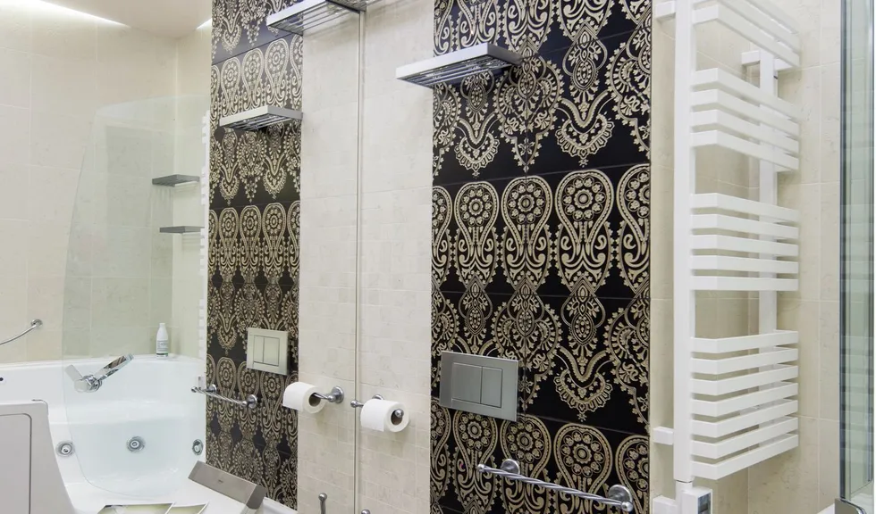 Для ванной в тёплых тонах были выбраны светильники со светодиодными лампами arlight® тёплого белого свечения, дабы создать уютную атмосферу. Для интерьера ванной на другом стенде была применена светодиодная лента arlight® дневного белого свечения, которая была установлена в нишах потолка из гипсокартона и служит в качестве источника основного освещения.