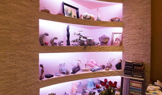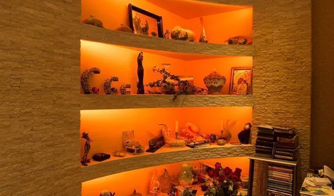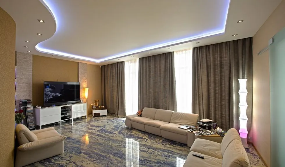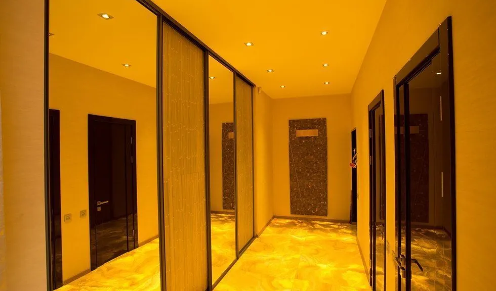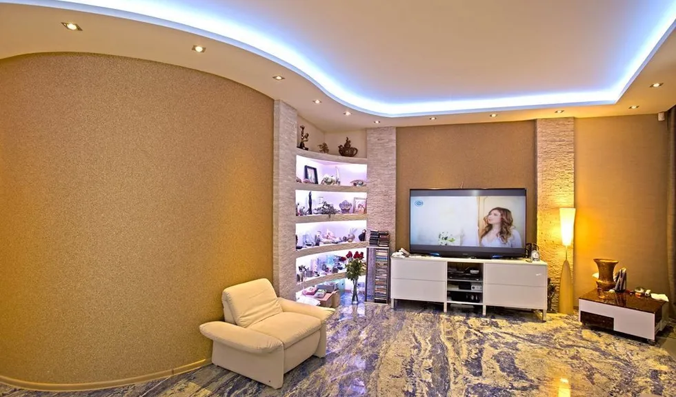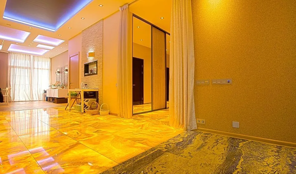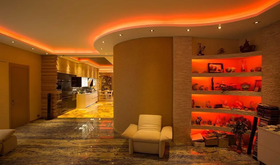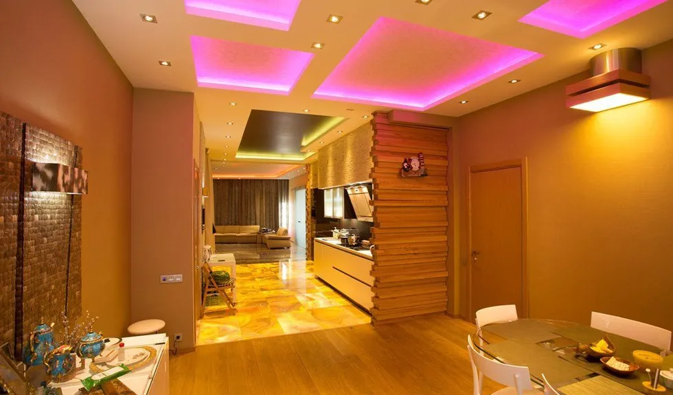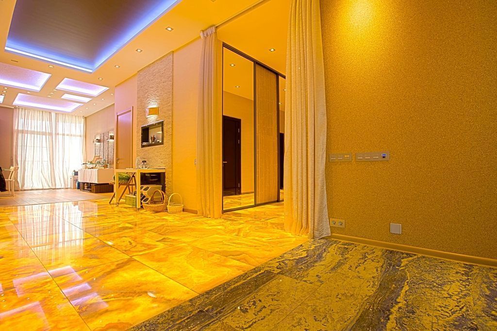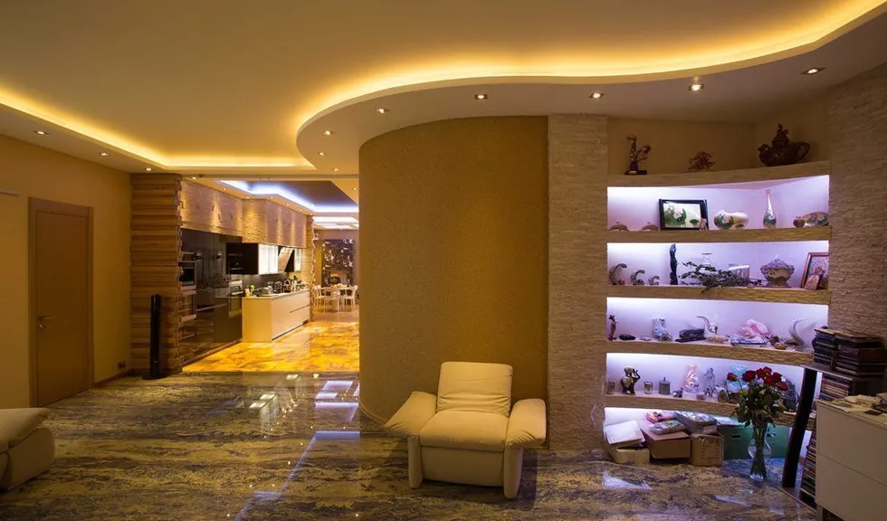 Проект квартиры со светодиодной многоцветной подсветкой, установленной на многоуровневых потолках. Основной изюминкой данного интерьера стал пол из оникса со светодиодной подсветкой. Для реализации проекта использовалось светодиодное оборудование торговой марки