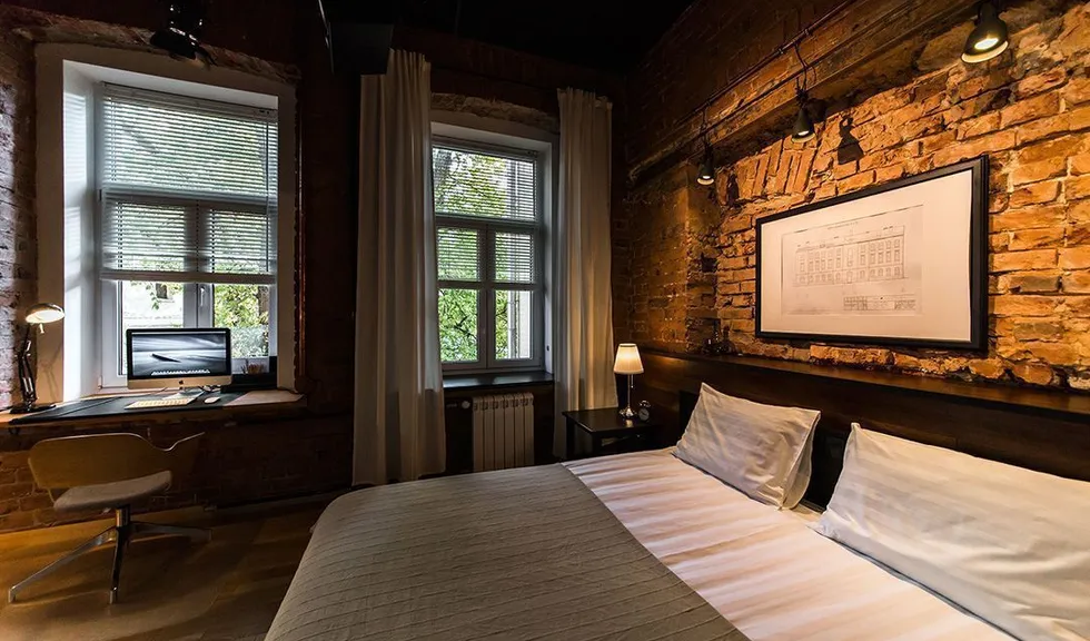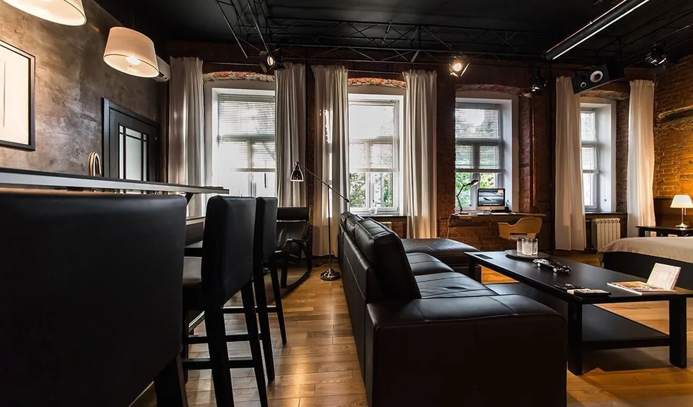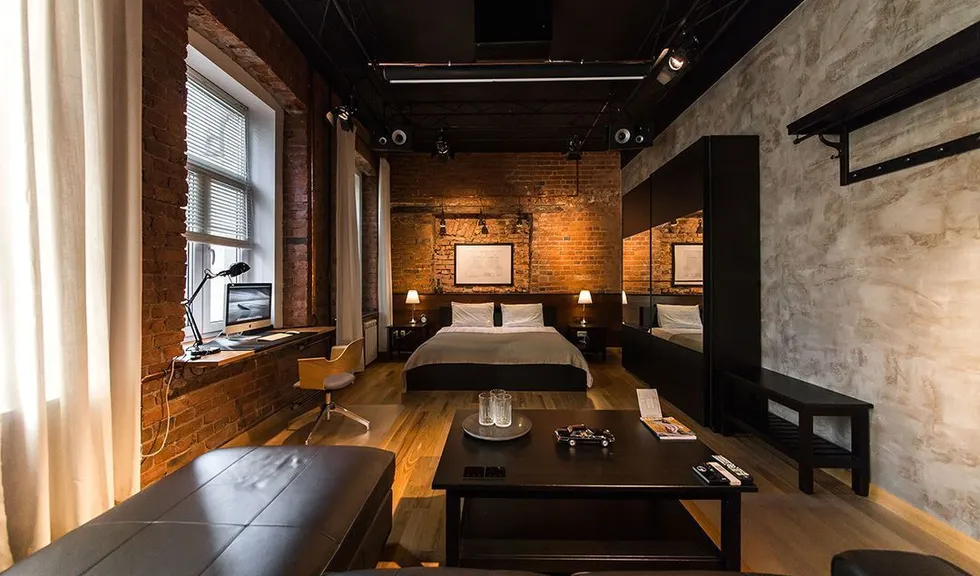 Интерьер московской квартиры-студии выполнили в стиле джазового кафе: кирпичные стены, дерево, обилие кожаной мебели. Особенной деталью этого интерьера стала ферма, установленная под потолком. На ферме подвешены софиты и акустические колонки.