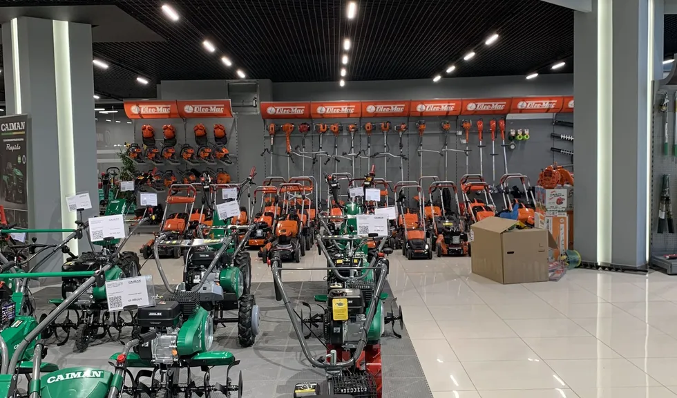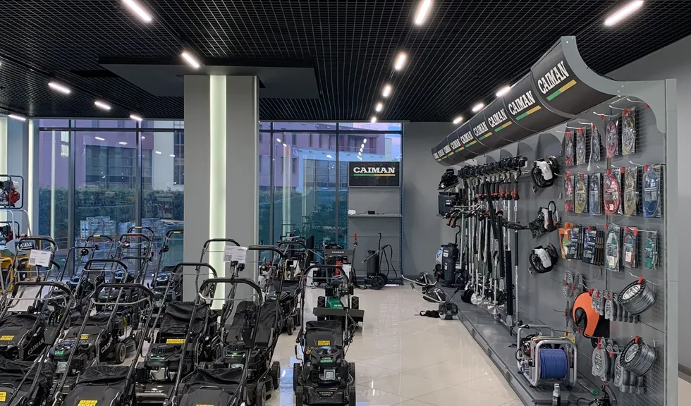 Сегодня на месте «Армстронга» — черный матовый потолок «Грильято». На его фоне линии трековых систем смотрятся стильно, подчеркивая техническую направленность шоурума. В выставочном зале с высокими потолками применяется комбинированное освещение: трековые светильники цилиндрической формы для расстановки световых акцентов и компактные встраиваемые даунлайты на потолке для основного освещения. Такое сочетание позволило создать в шоуруме гармоничный и комфортный свет для осмотра садового оборудования.
