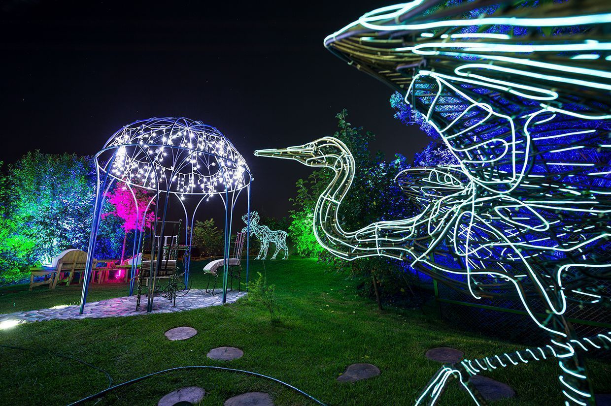 Для подсветки декоративного водоёма (пруда) применена многоцветная RGB светодиодная лента arlight®, защищённая от влаги со степенью защиты IP67. Лента закреплена с нижней стороны мостков. Управление осуществляется при помощи многозонного пульта ДУ arlight® - SR-2819T8 Black с сенсорным управлением в сочетании с RGB контроллерами arlight® - SR-1009EA.