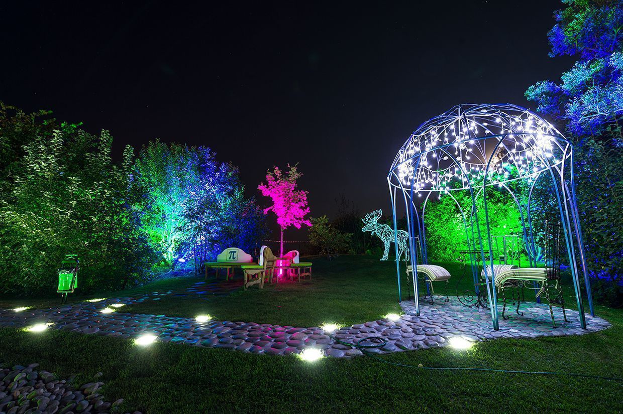 Светодиодная ландшафтная подсветка состоит из подсветки деревьев и освещения дорожек. Для подсветки деревьев используются герметичные светодиодные прожекторы, собранные на основе алюминиевого профиля для светодиодов и светодиодных лент arlight® - SL80 и мощных RGB светодиодов arlight® - ARPL-3W-EPA-RGB с линзами 30°.