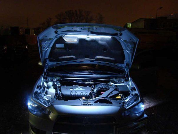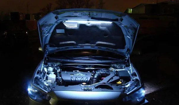 Аналогично подсветке багажника устанавливается и подсветка подкапотного пространства, которая, пожалуй, играет ещё более важную роль, т.к. никто не застрахован от поломки автомобиля в самое неудобное время. Здесь чаще также используется подсветка белого цвета. Например, светодиодная лента arlight® - RTW 2-5000SE 12V White 2x(3528, 600LED, LUX) или RT 2-5000 12V White 2X (5060, 300 LED, LUX).