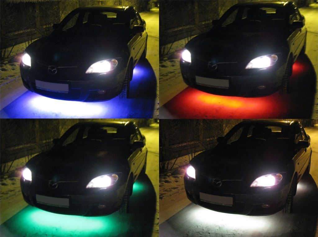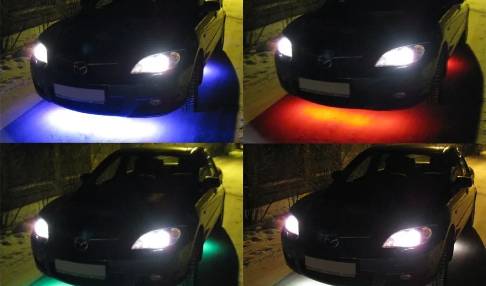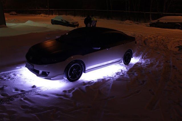 Начнём, пожалуй, с внешнего освещения. Одним из хитов автомобильного освещения была и остаётся подсветка днища. Хрупкий неон давно вышел из моды, и теперь всем заправляет светодиодная лента. Широкое разнообразие моделей, представленных на рынке, позволяет оформить машину именно так, как хочет владелец: разная степень яркости ленты, просто белая или цветная, а может и вовсе RGB, чтобы переливаться всеми цветами радуги, привлекая внимание других автомобилистов! Тем более, современные контроллеры позволяют сделать из подсветки днища даже цветомузыку!