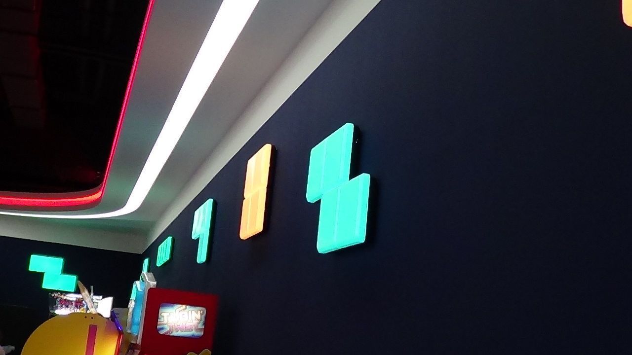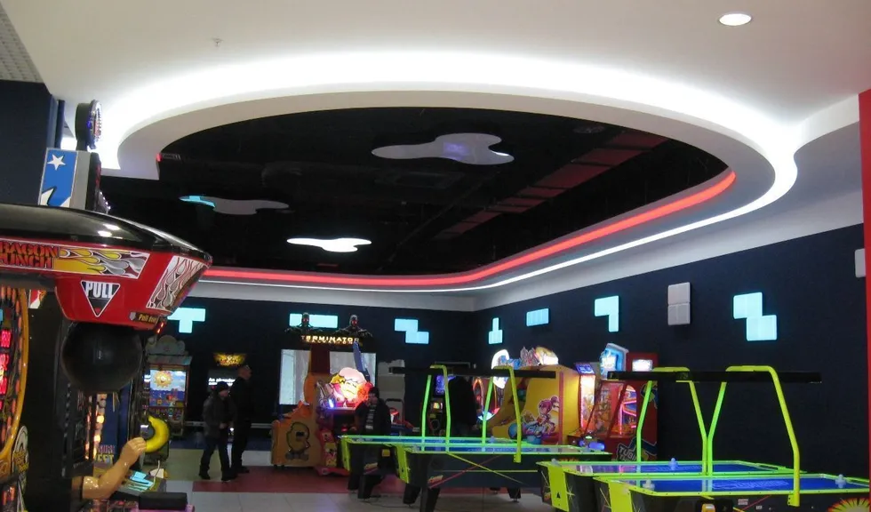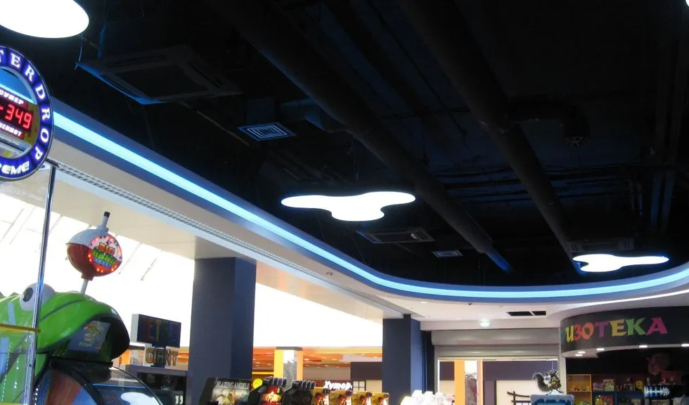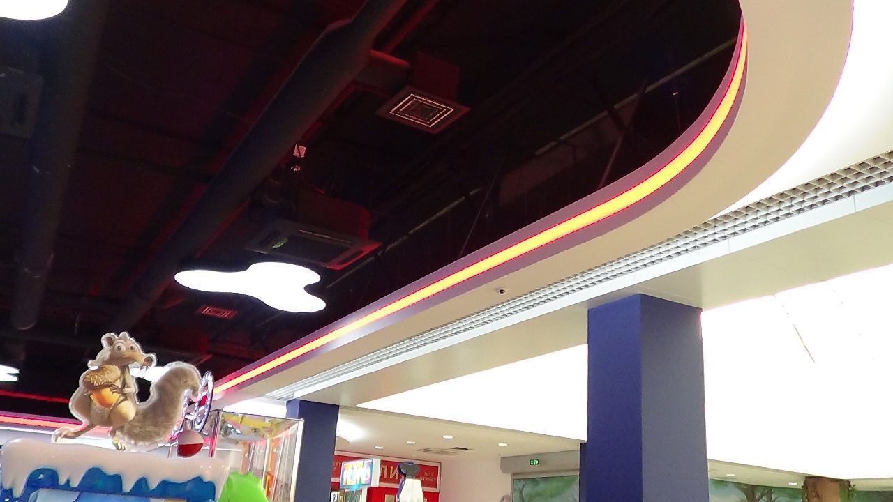 Светодиодная лента также была использована для закарнизной подсветки потолка. Она была установлена в потолочных нишах 1-ого и 2-ого этажа, а также в вышеупомянутом Игропарке. Для подсветки потолка была применена многоцветная RGB светодиодная лента, подключенная к RGB контроллеру, который позволяет легко менять цвет и яркость подсветки с пульта ДУ.