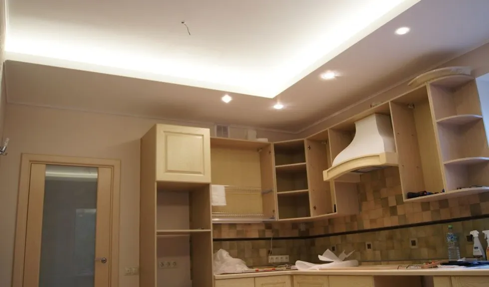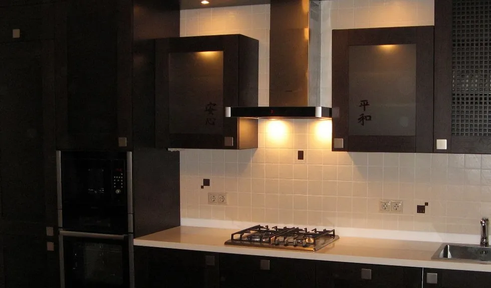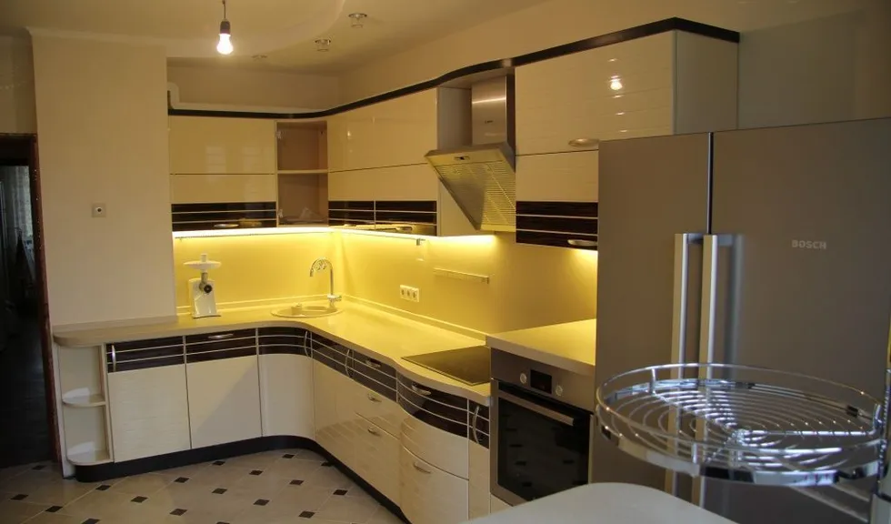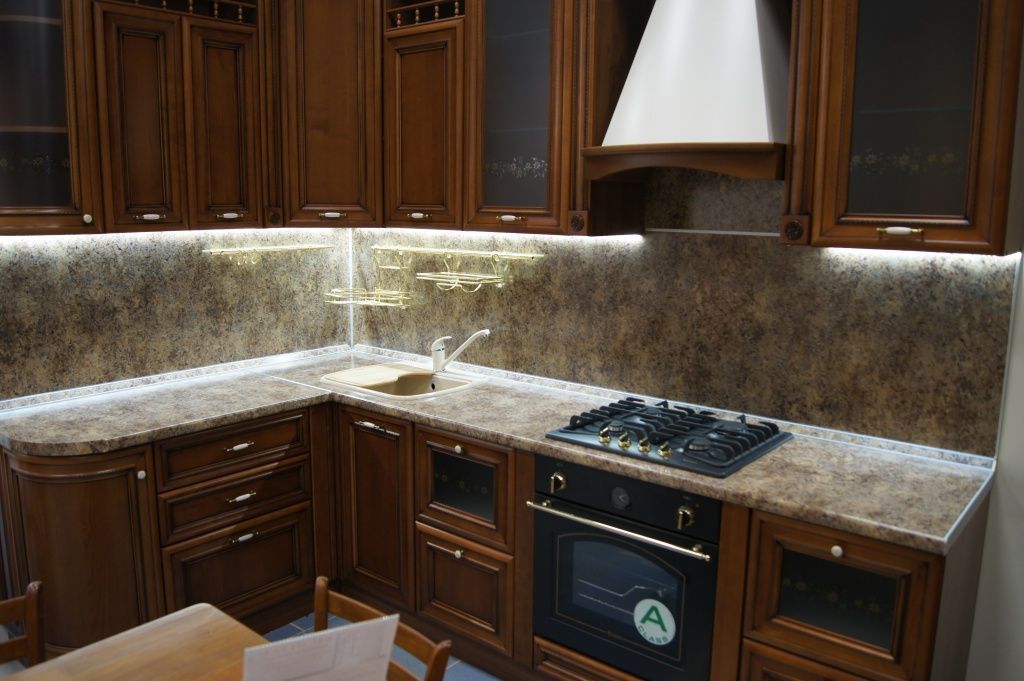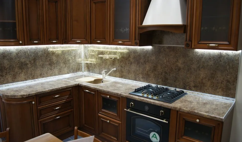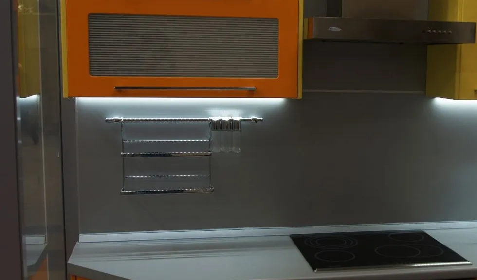 Подсветку рабочей поверхности устраивают под навесными шкафами. Существует несколько вариантов ее организации: