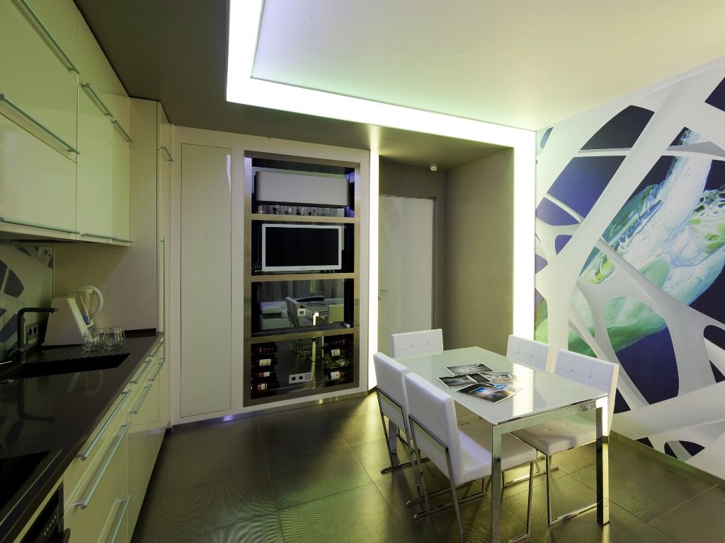 Первое, что приходит в голову, когда слышишь «светодиодная подсветка кухни» - это подсветка рабочей поверхности. Но возможности светодиодного оборудования и сфера его применения гораздо шире. Давайте сначала поговорим о декоративной подсветке. Декоративная подсветка не несет функциональной нагрузки и является своеобразным украшением интерьера, дополнительным инструментом создания атмосферы. На кухне она организуется по верху навесных и в нижней части напольных шкафов.