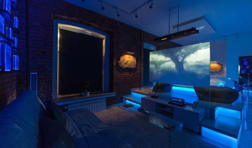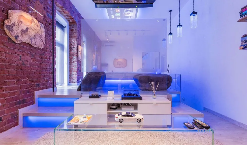 Для создания особой атмосферы в квартире-студии был выбран синий цвет светодиодной подсветки.