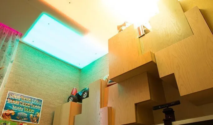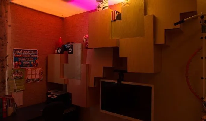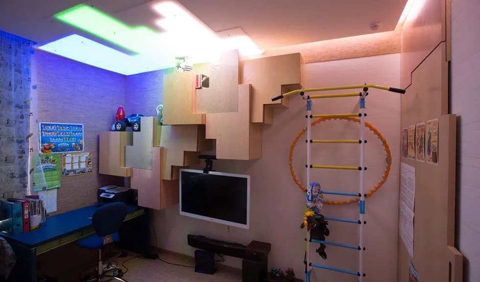 Освещение комнаты для подростка достаточно нестаднартно. Основное освещение и здесь решено с помощью светодиодной ленты arlight®. С одной стороны комнаты в гипсокартонном потолке предусмотрены специальные ниши геометрической формы, внутрь которых RGB-лента arlight® вклеена таким образом, чтобы создавалось равномерное свечение. Ниши также закрыты матовым, пропускающим свет, пластиком. Подобная конструкция, как и полосы в остальных комнатах, одновременно обеспечивает и функциональное, и декоративное освещение. По двум сторонам детской с помощью гипсокартонного потолка образована узкая ниша, в которой также разместилась RGB-подсветка.