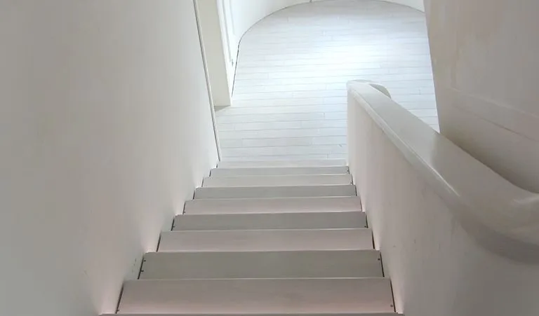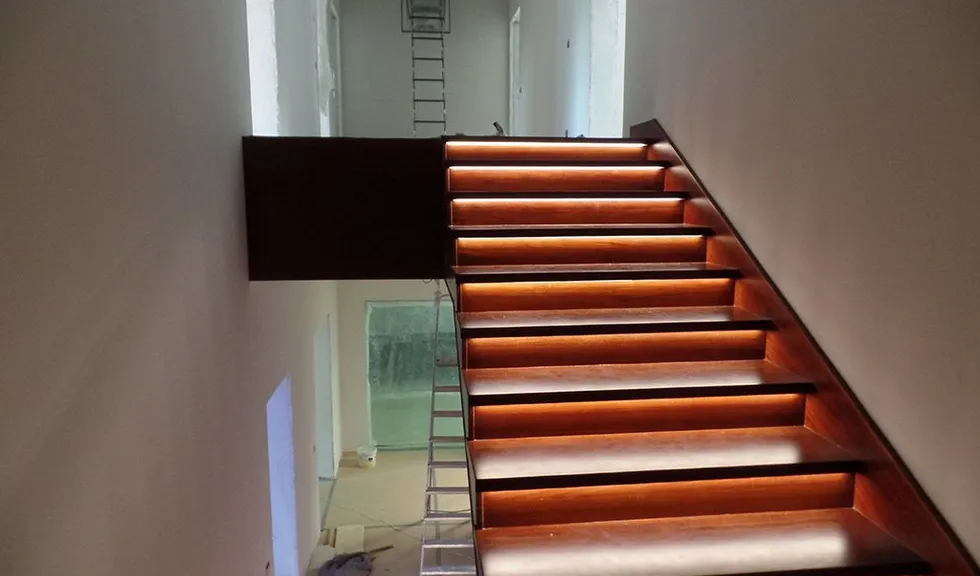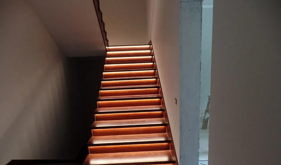 Самый простой способ организовать подсветку лестницы - установить светодиодную ленту на нижнюю сторону её ступеней. Такой способ подойдет, если край ступени немного выпирает или ступень вовсе отдельная. При такой установке светодиодной ленты верхняя ступень будто освещает нижнюю. Ступени хорошо освещены, но при этом лента не бросается в глаза и не слепит, т.к. светодиоды направлены вниз. Для такого способа установки обычно применяется влагозащищённая светодиодная лента со степенью защиты IP65, дабы уберечь её от попадания влаги при проведении влажной уборки. Другой вариант - использовать открытую светодиодную ленту, установленную в алюминиевый профиль с экраном.